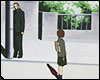 : открывается дверь. топ, топ, топ, топ, Лэйн спускается по ступенькам. как всегда, она идет в школу под гул проводов. идя по улице, она замечает, что за столбом стоит какой-то мужчина и наблюдает за ней. мужчина одет в черное, слегка небрит, у него зеленые глаза и слегка безумный взгляд. испуганная Лэйн несколько секунд глядит на незнакомца, потом разворачивается и быстро убегает