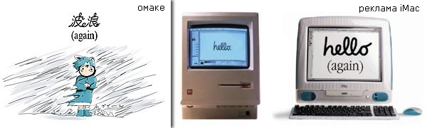 фраза "hello (again)" встречается в рекламе iMac. это - кивок в сторону рекламы старых Макинтошей, на которой был изображен Мак с надписью "hello" на экране