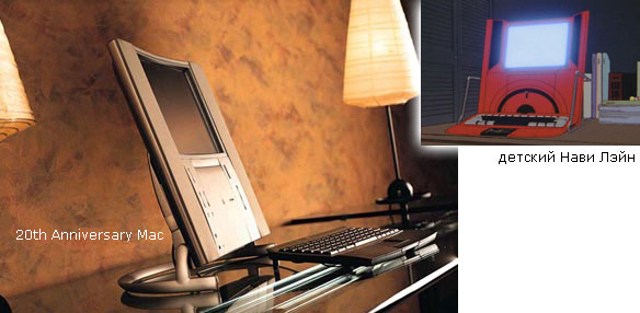 : создатели лэйн знают довольно много о компьютерах. сериал наполнен спецэффектами, сделанными на машинах Apple Macintosh. Тиаки Конака, автор сценария к сериалу, упоминал в одном из своих интервью, что многие из людей, работавших вместе с ним над лэйн, были пользователями Маков, и сам он - большой любитель Apple Computers вообще и Макинтошей в частности. возможно, именно в связи с этим в сериале есть несколько ссылок на компьютеры Apple