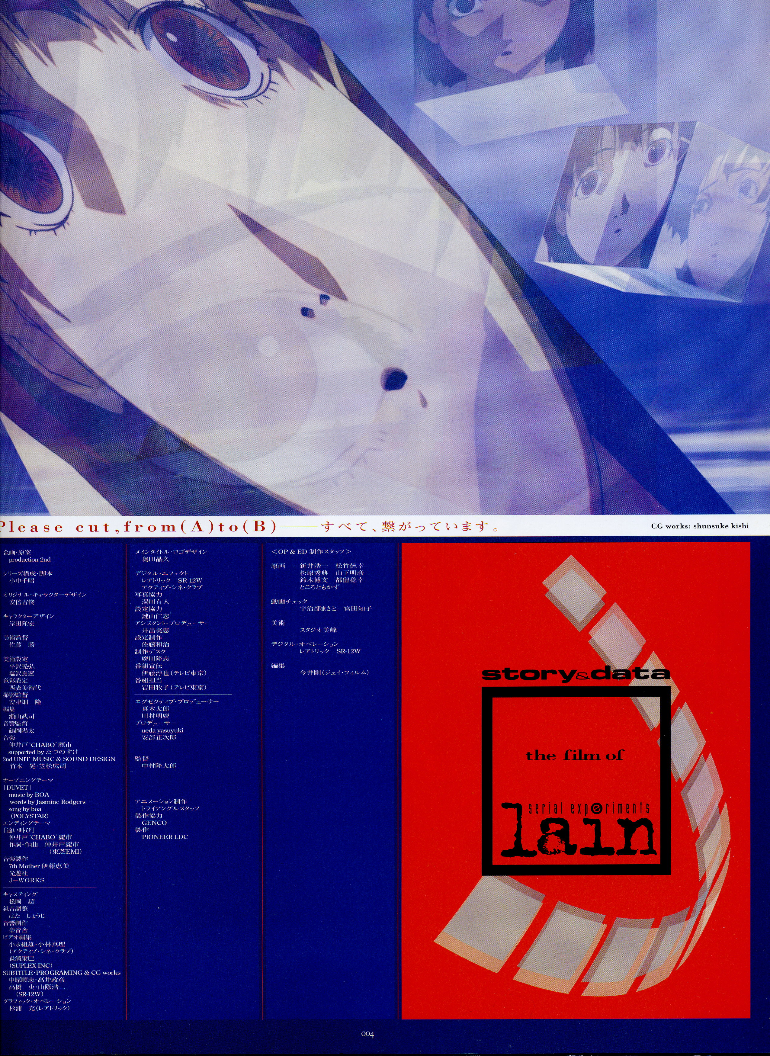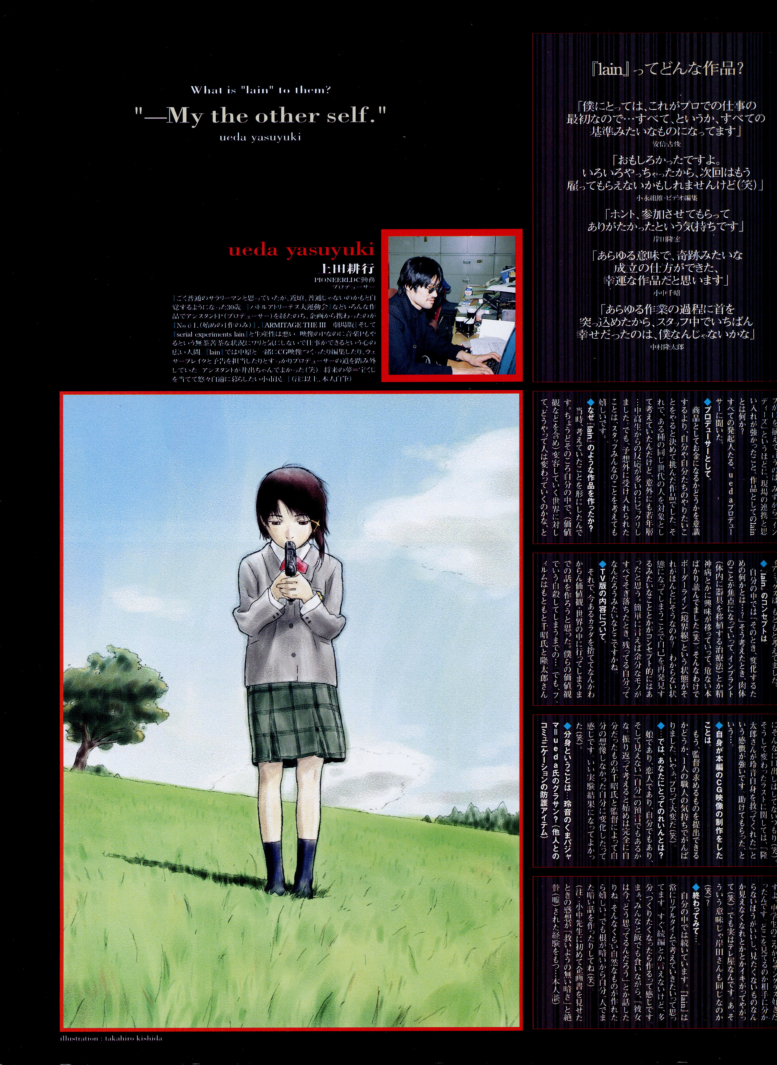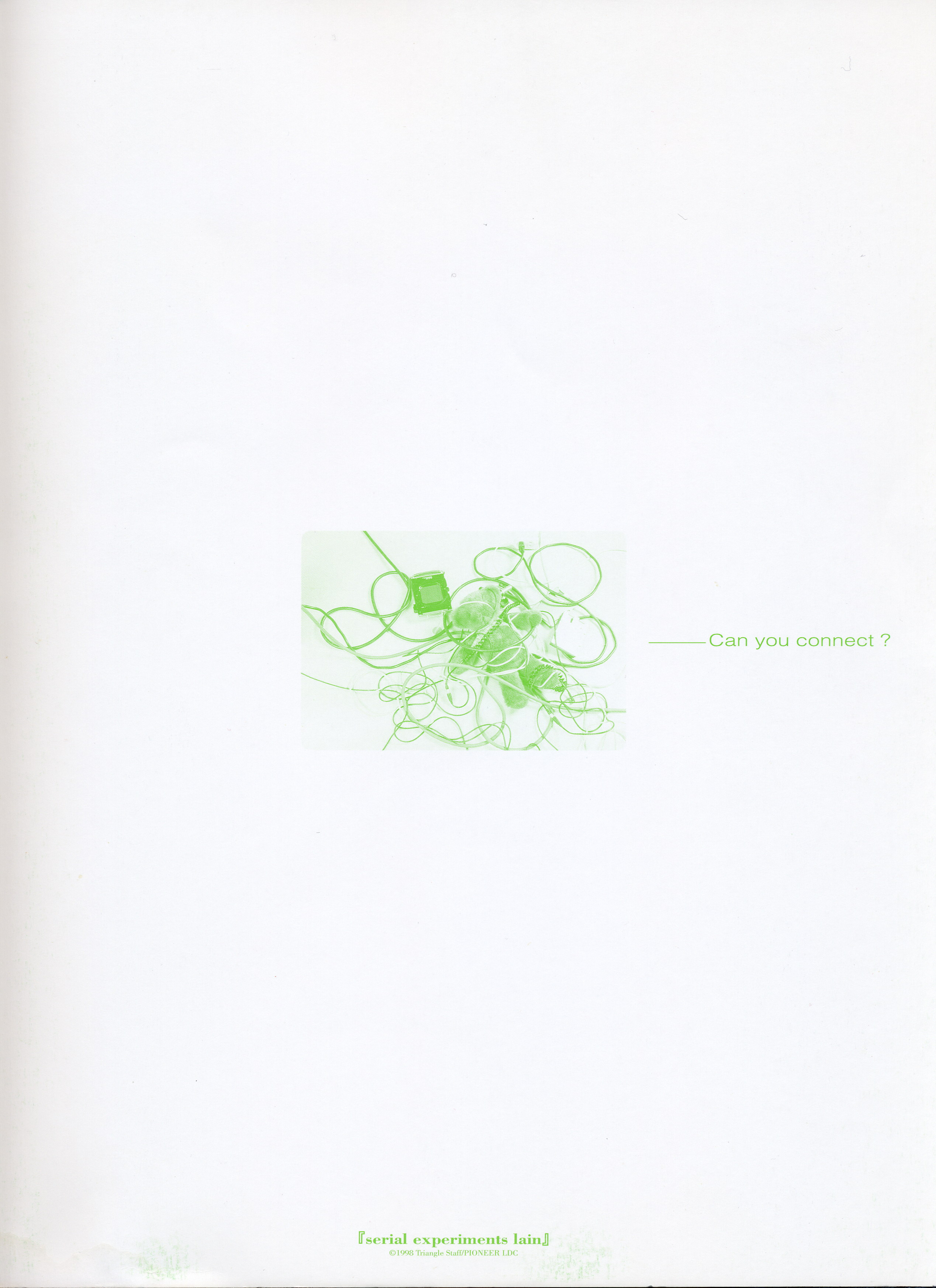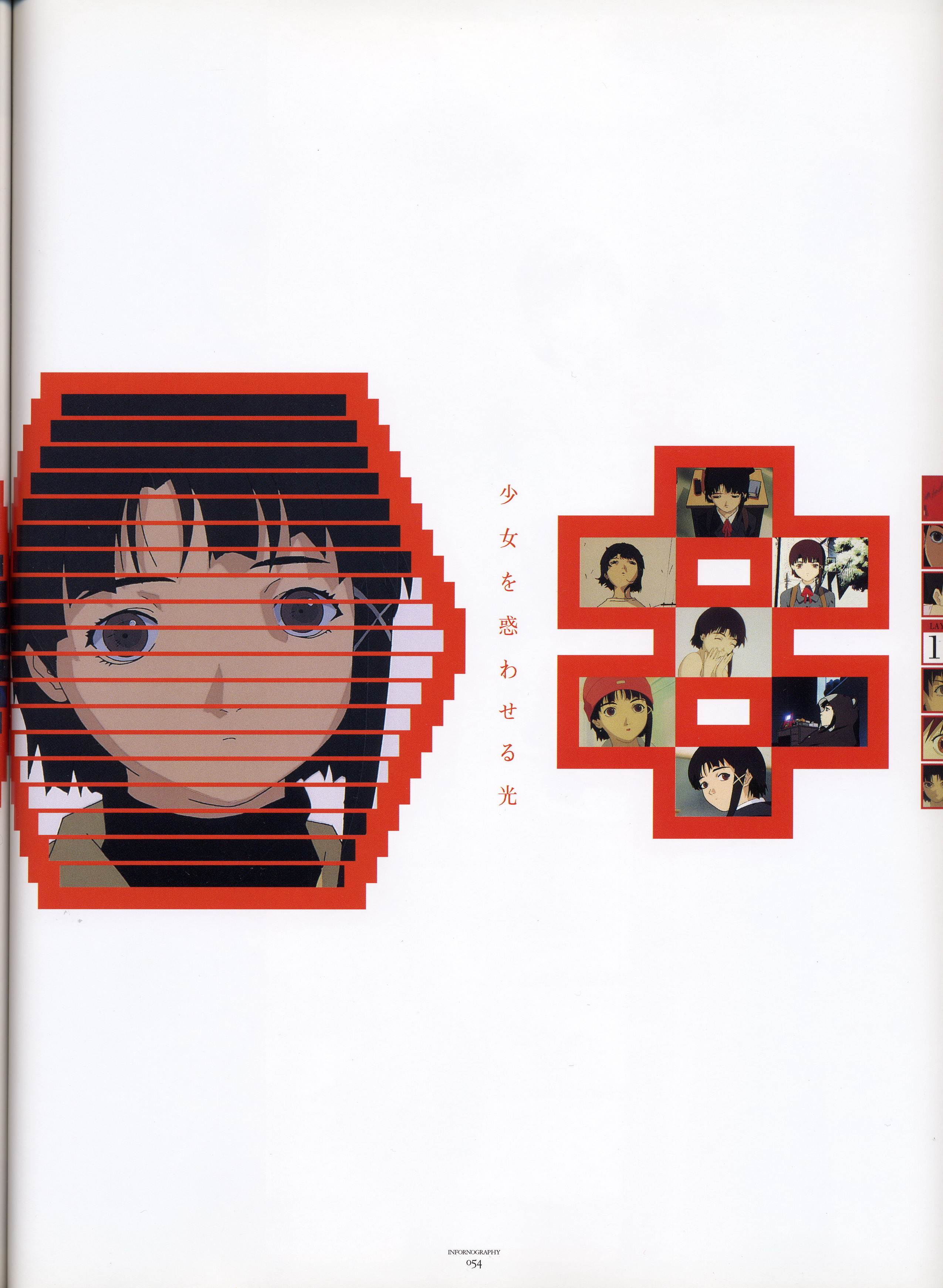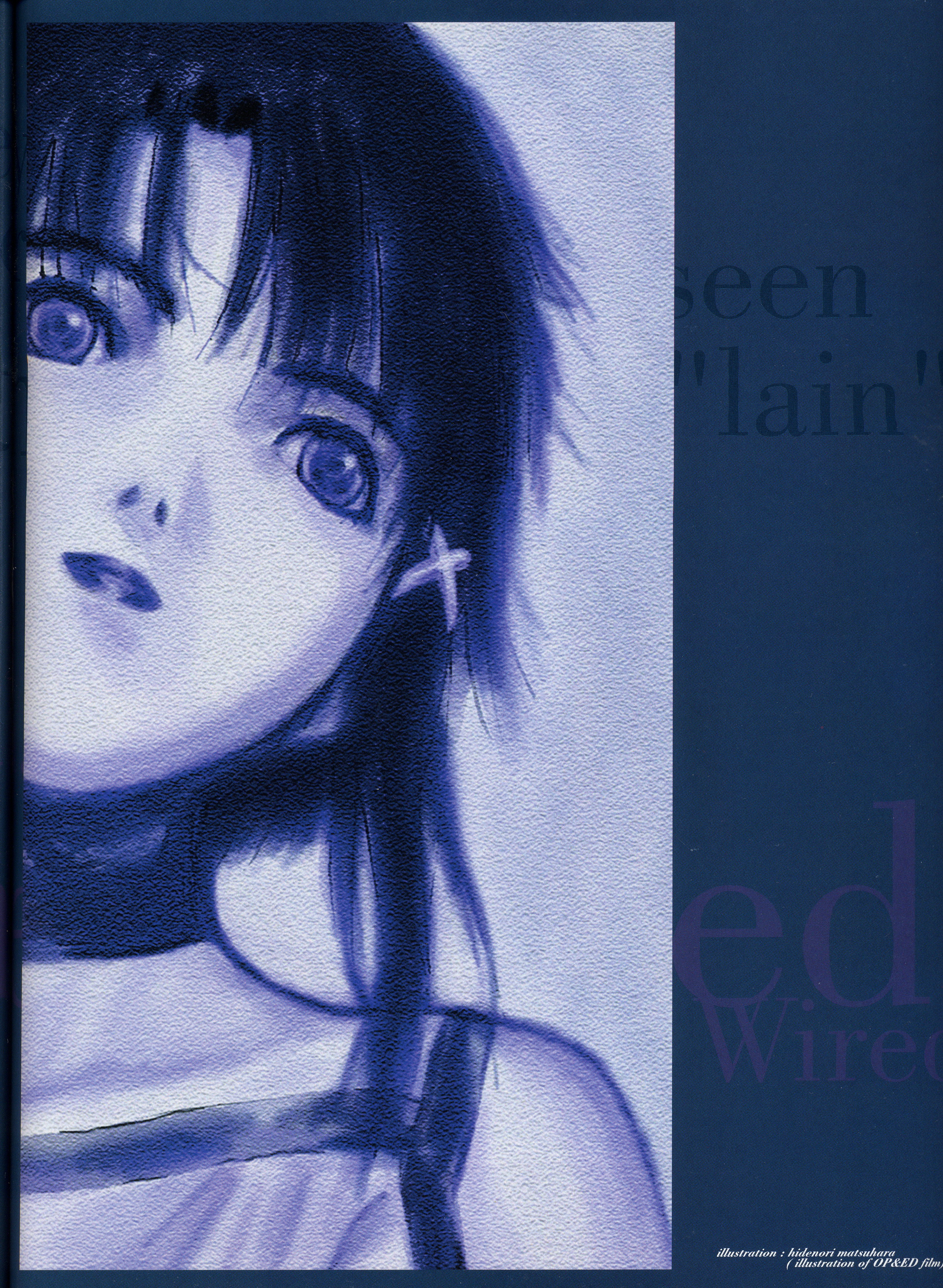 : после выпуска артбука Lain Illustrations (переиздание omnipresence in Wired) самым редким для поклонников стало издание Visual Experiments Lain, которое до сих пор отсутствовало даже в электронном виде в сети. Ко мне в руки чудом попал этот замечательный артбук (хвала японским букинистам на eBay =)) и я не преминул возможностью оставить его в истории. Книга содержит уйму текста на японском (к своему горю, я ничего не понимаю из того, что там написано), кучу карандашных набросков, зарисовок, и прочего дополнительного арта, использовавшегося как рабочий материал при создании сериала. Здесь выложен абсолютно полный скан артбука в 300 dpi, сканировал сам, единственный минус - артбук больше стандартных A4, поэтому края не влезли.