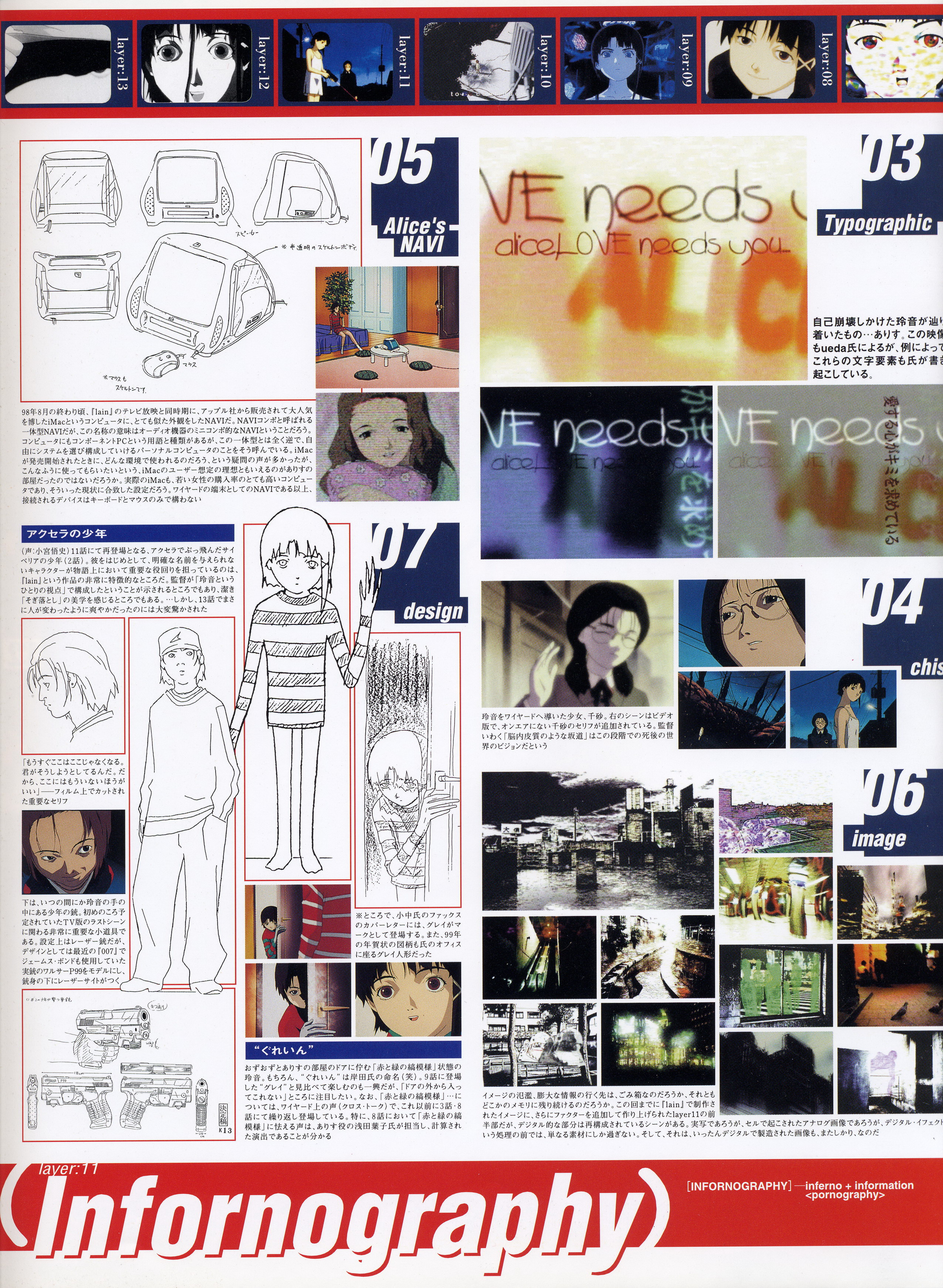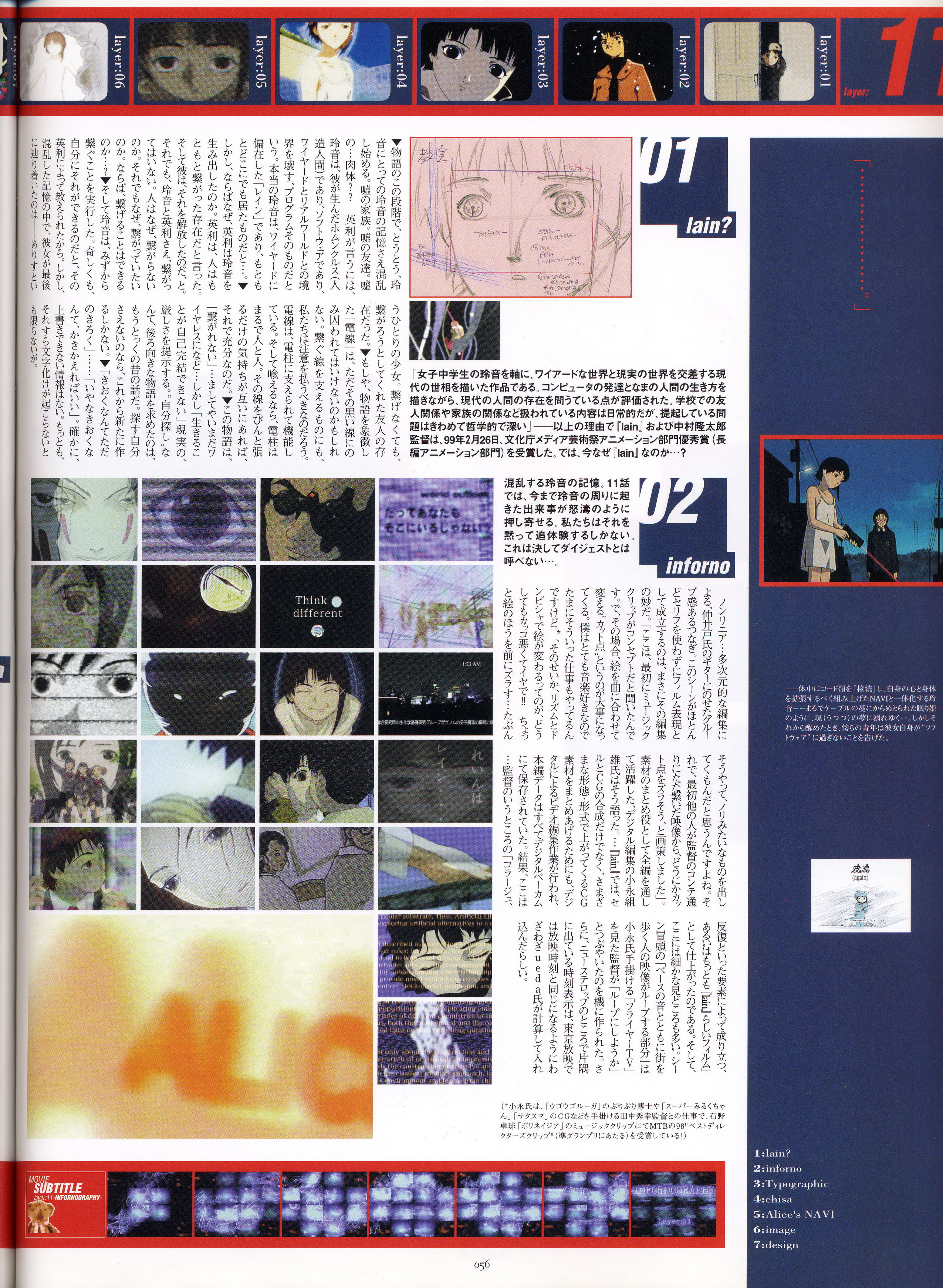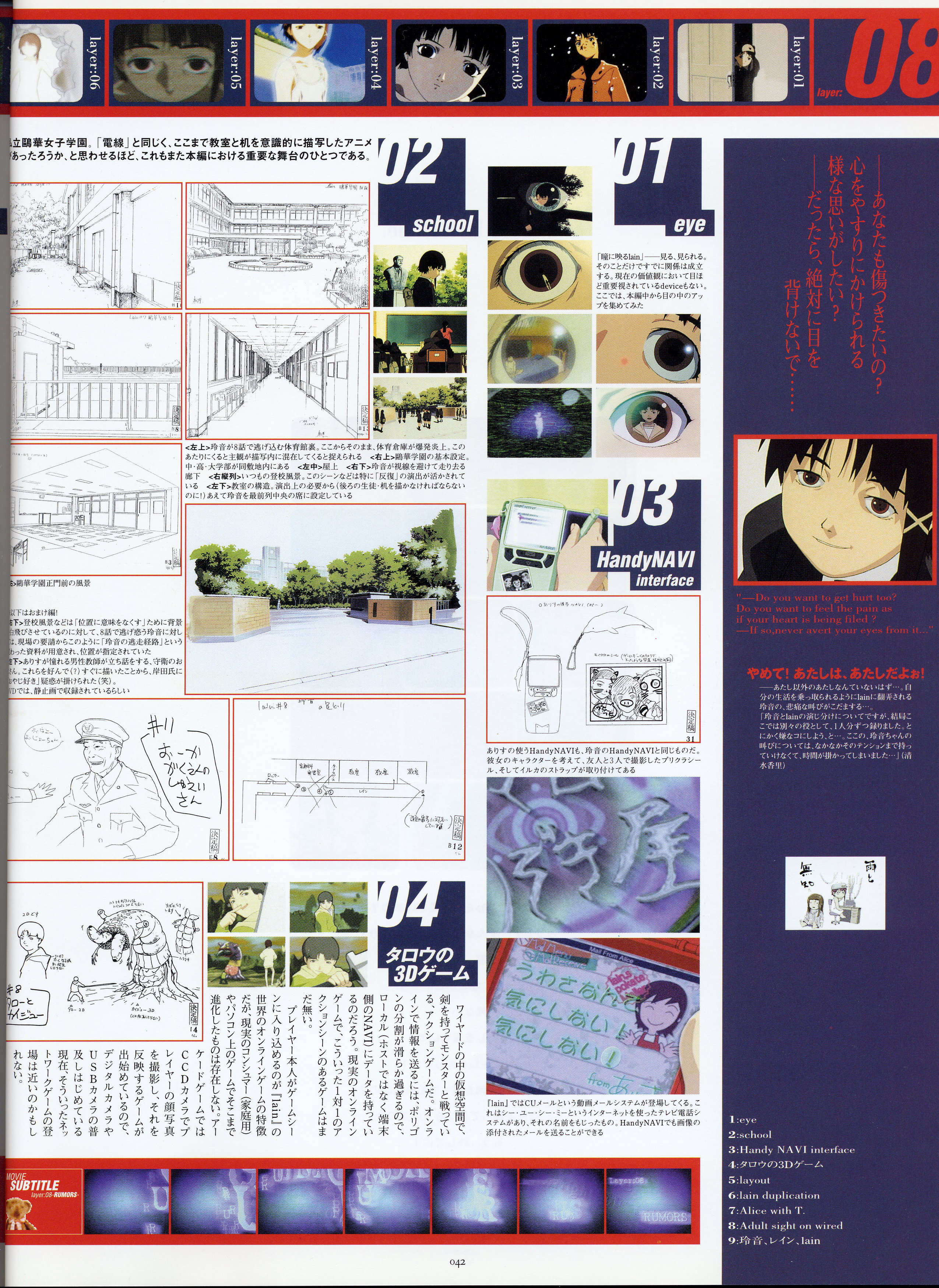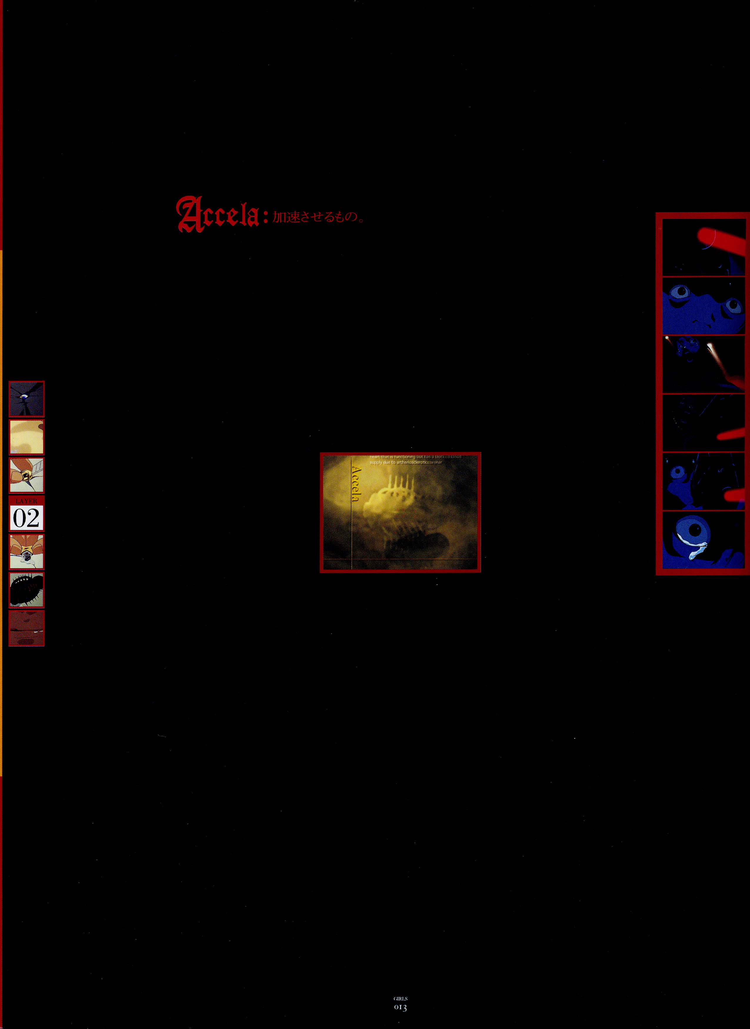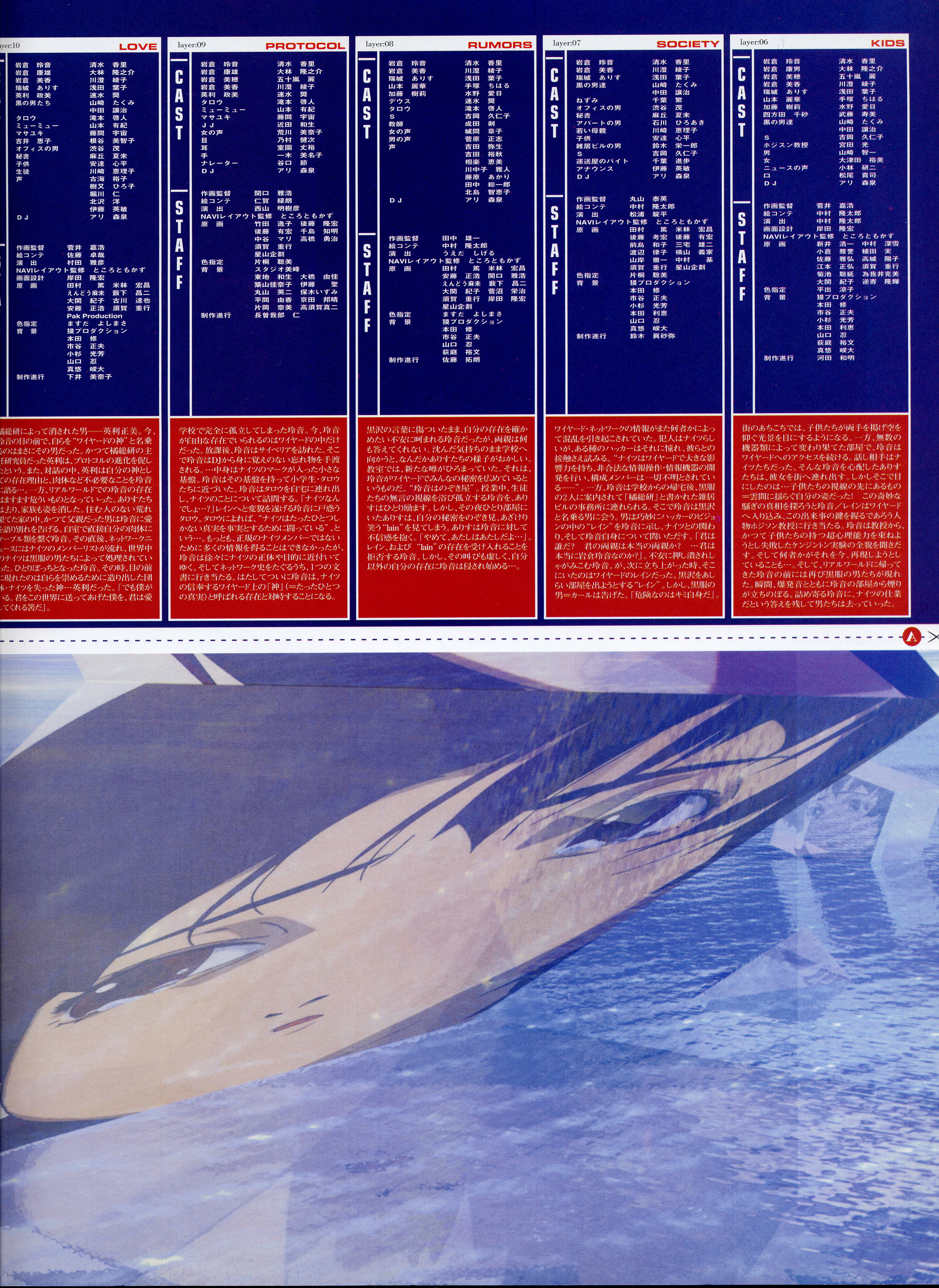 : после выпуска артбука Lain Illustrations (переиздание omnipresence in Wired) самым редким для поклонников стало издание Visual Experiments Lain, которое до сих пор отсутствовало даже в электронном виде в сети. Ко мне в руки чудом попал этот замечательный артбук (хвала японским букинистам на eBay =)) и я не преминул возможностью оставить его в истории. Книга содержит уйму текста на японском (к своему горю, я ничего не понимаю из того, что там написано), кучу карандашных набросков, зарисовок, и прочего дополнительного арта, использовавшегося как рабочий материал при создании сериала. Здесь выложен абсолютно полный скан артбука в 300 dpi, сканировал сам, единственный минус - артбук больше стандартных A4, поэтому края не влезли.