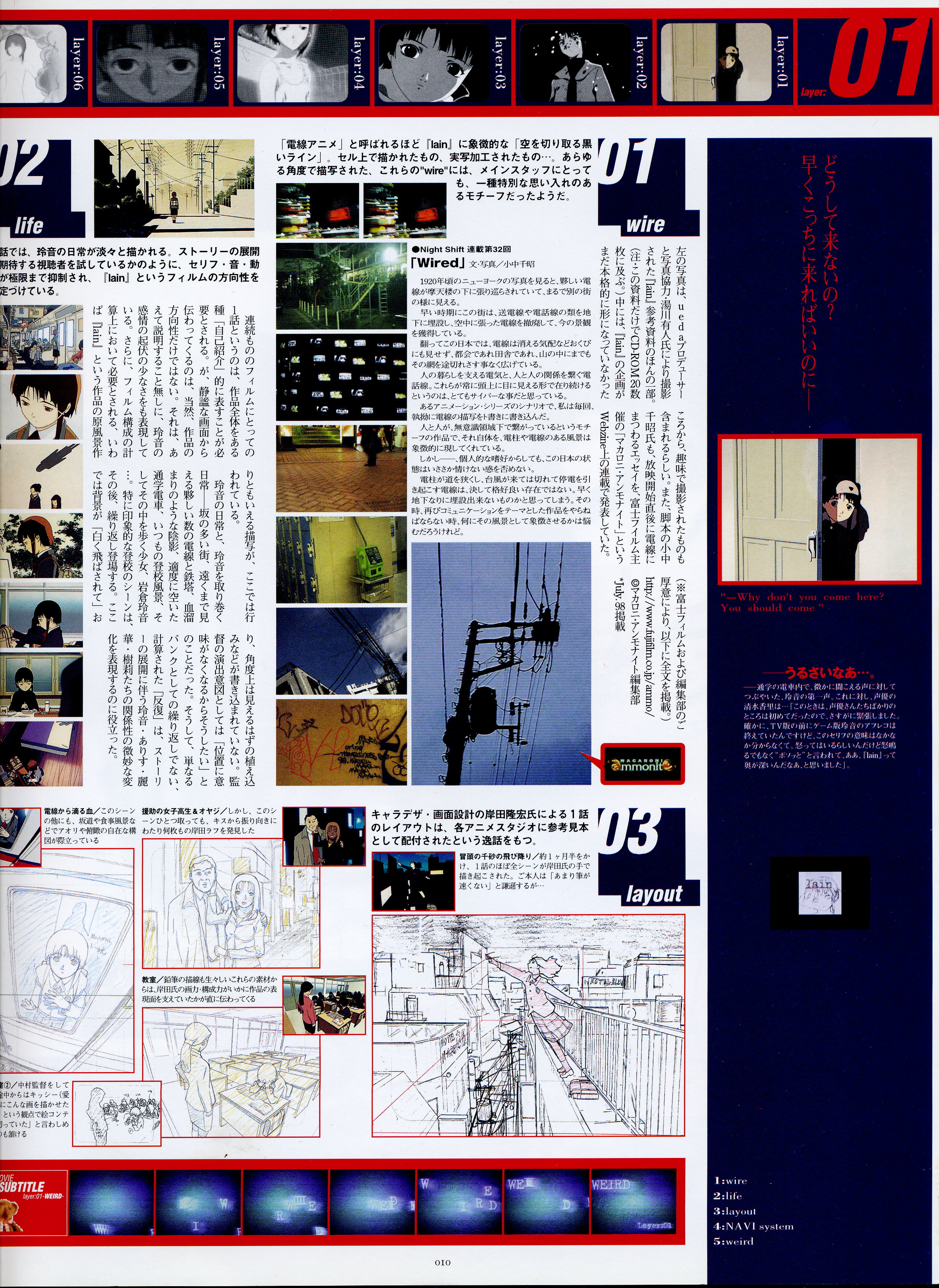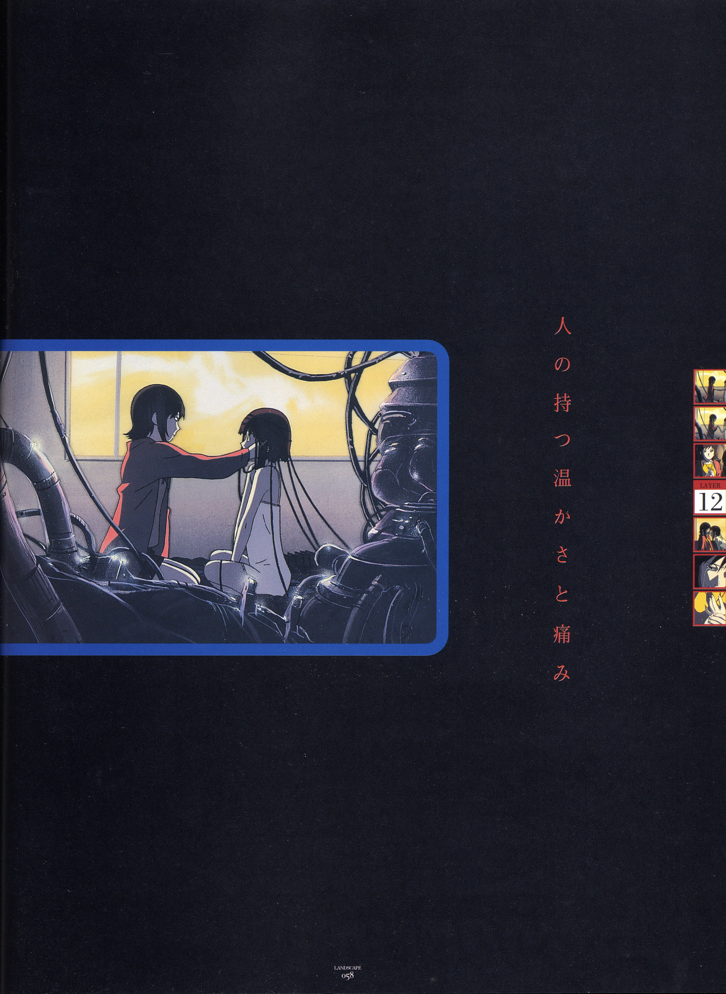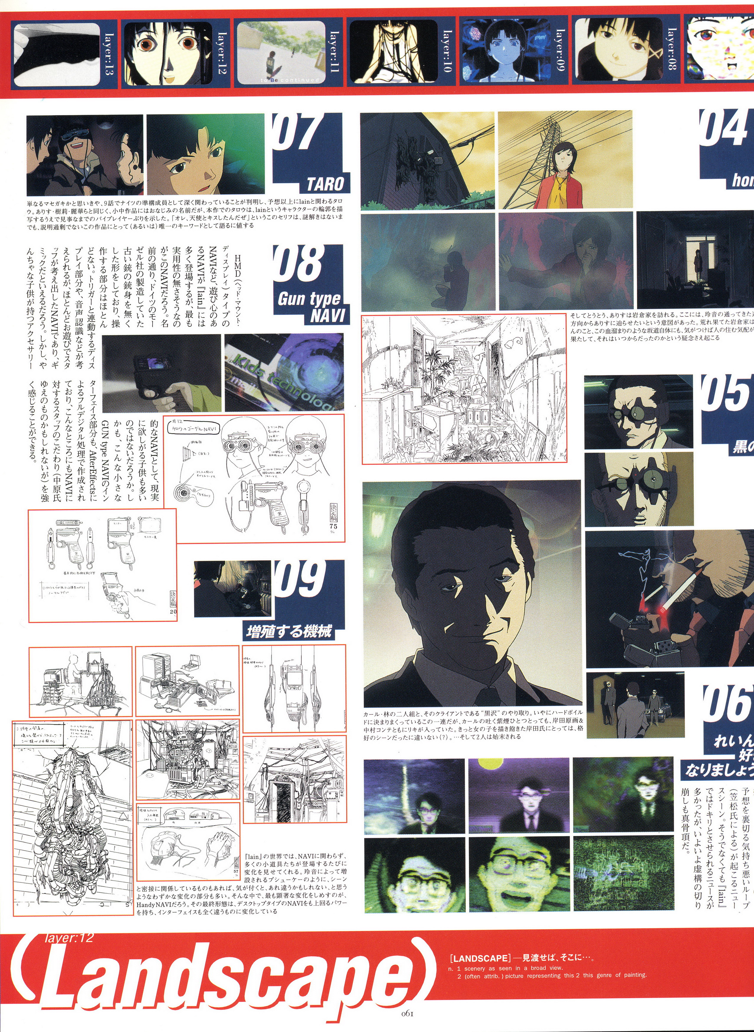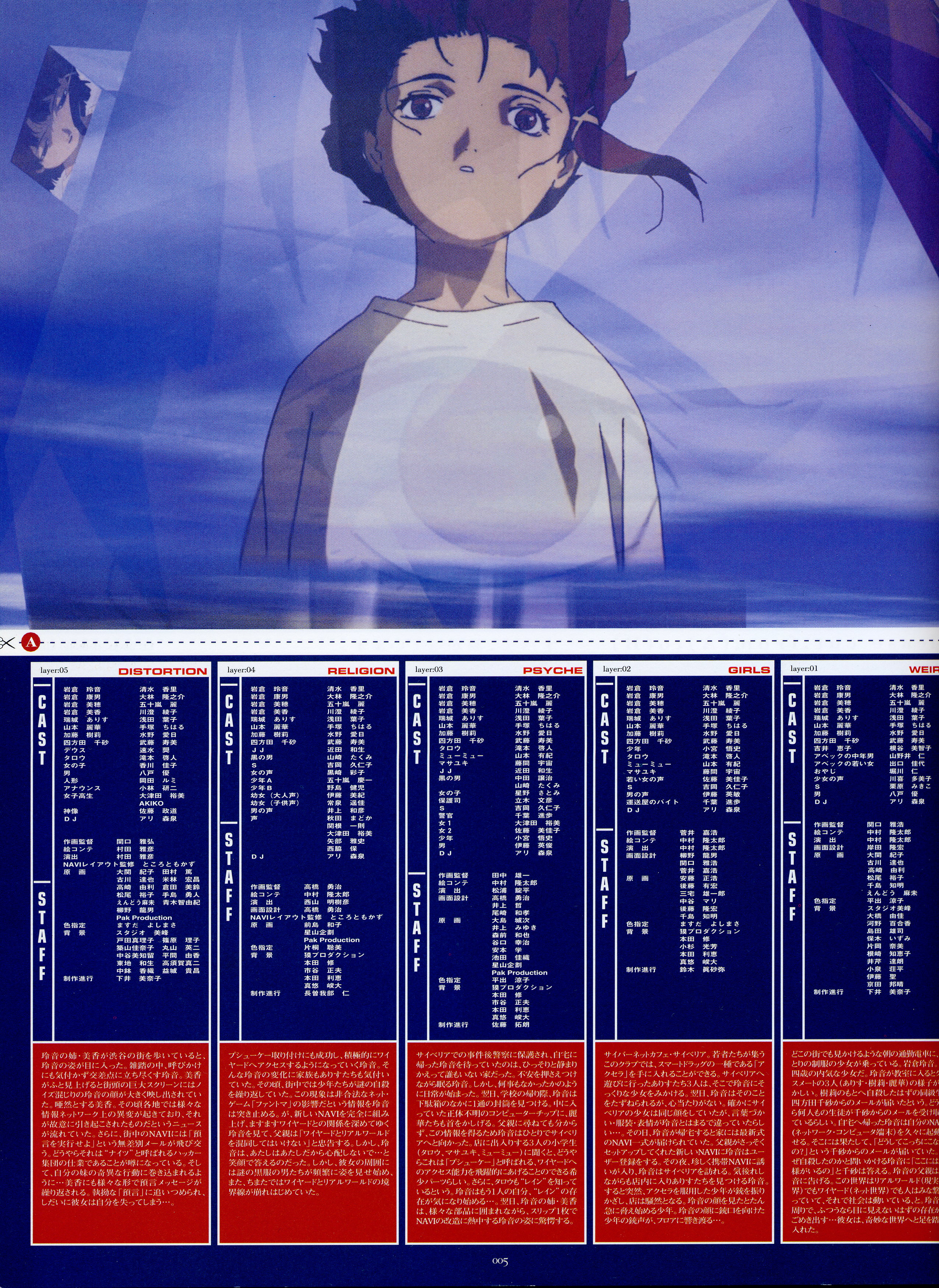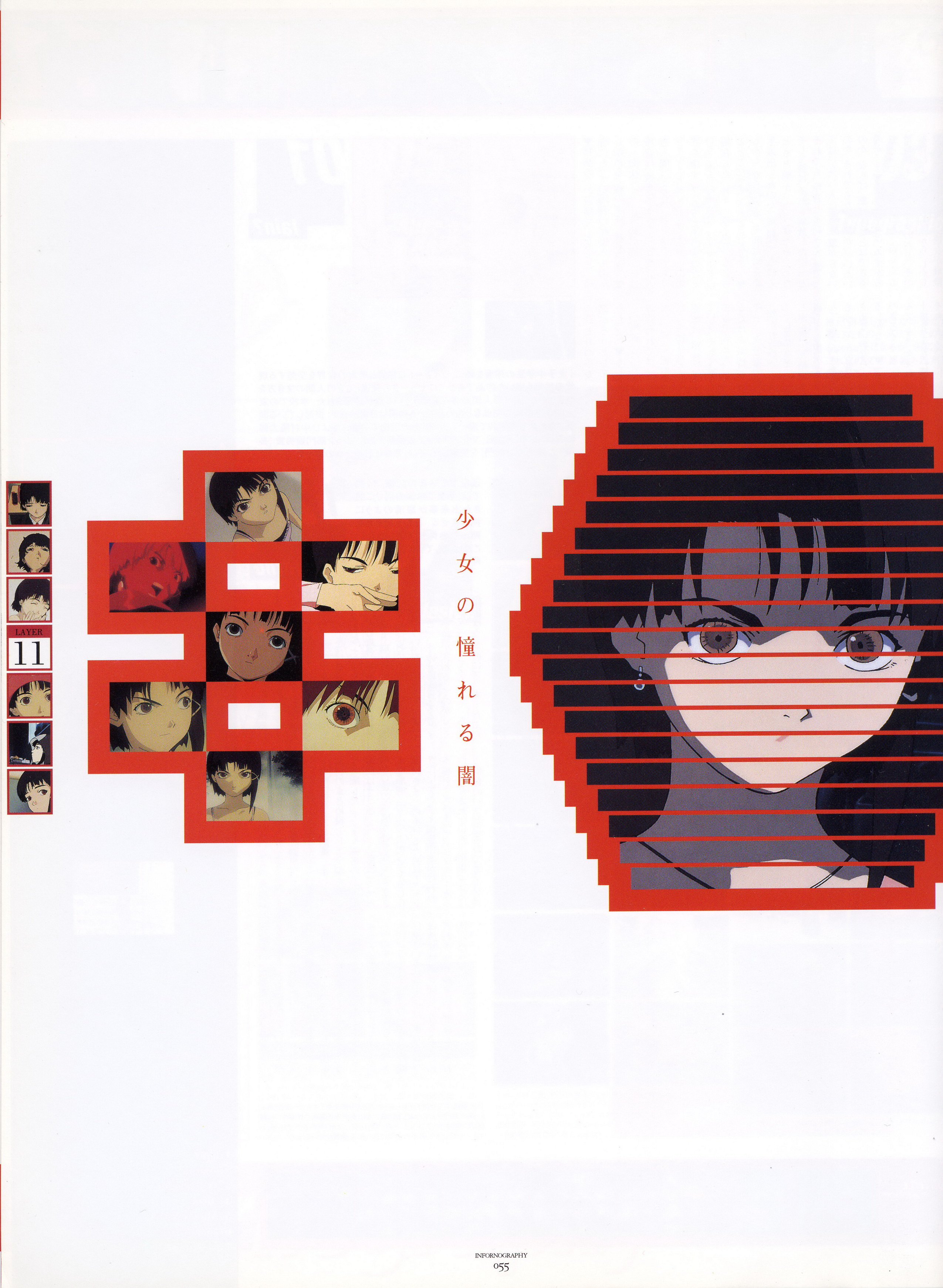 : после выпуска артбука Lain Illustrations (переиздание omnipresence in Wired) самым редким для поклонников стало издание Visual Experiments Lain, которое до сих пор отсутствовало даже в электронном виде в сети. Ко мне в руки чудом попал этот замечательный артбук (хвала японским букинистам на eBay =)) и я не преминул возможностью оставить его в истории. Книга содержит уйму текста на японском (к своему горю, я ничего не понимаю из того, что там написано), кучу карандашных набросков, зарисовок, и прочего дополнительного арта, использовавшегося как рабочий материал при создании сериала. Здесь выложен абсолютно полный скан артбука в 300 dpi, сканировал сам, единственный минус - артбук больше стандартных A4, поэтому края не влезли.
