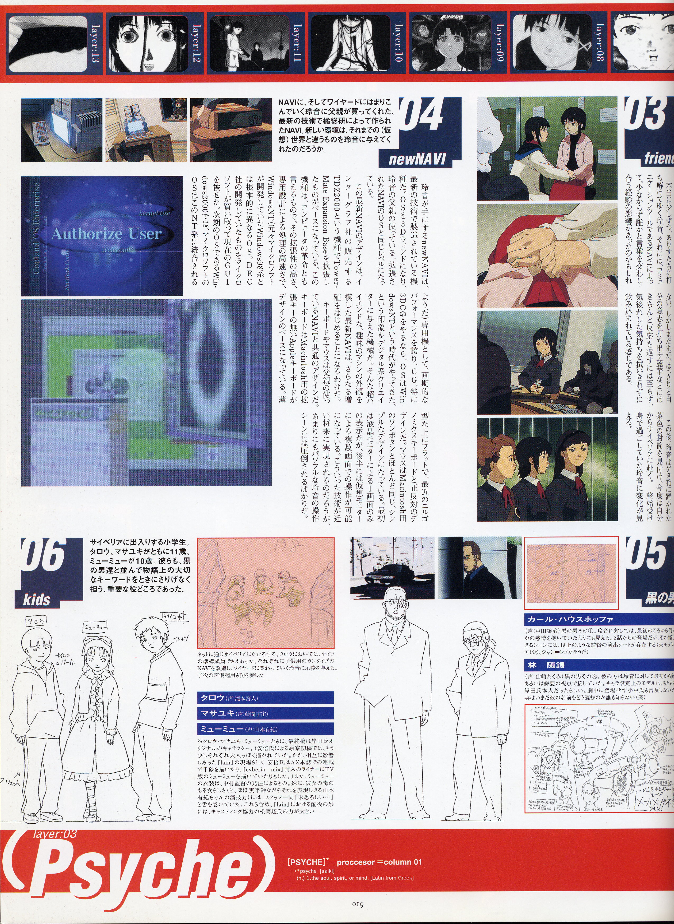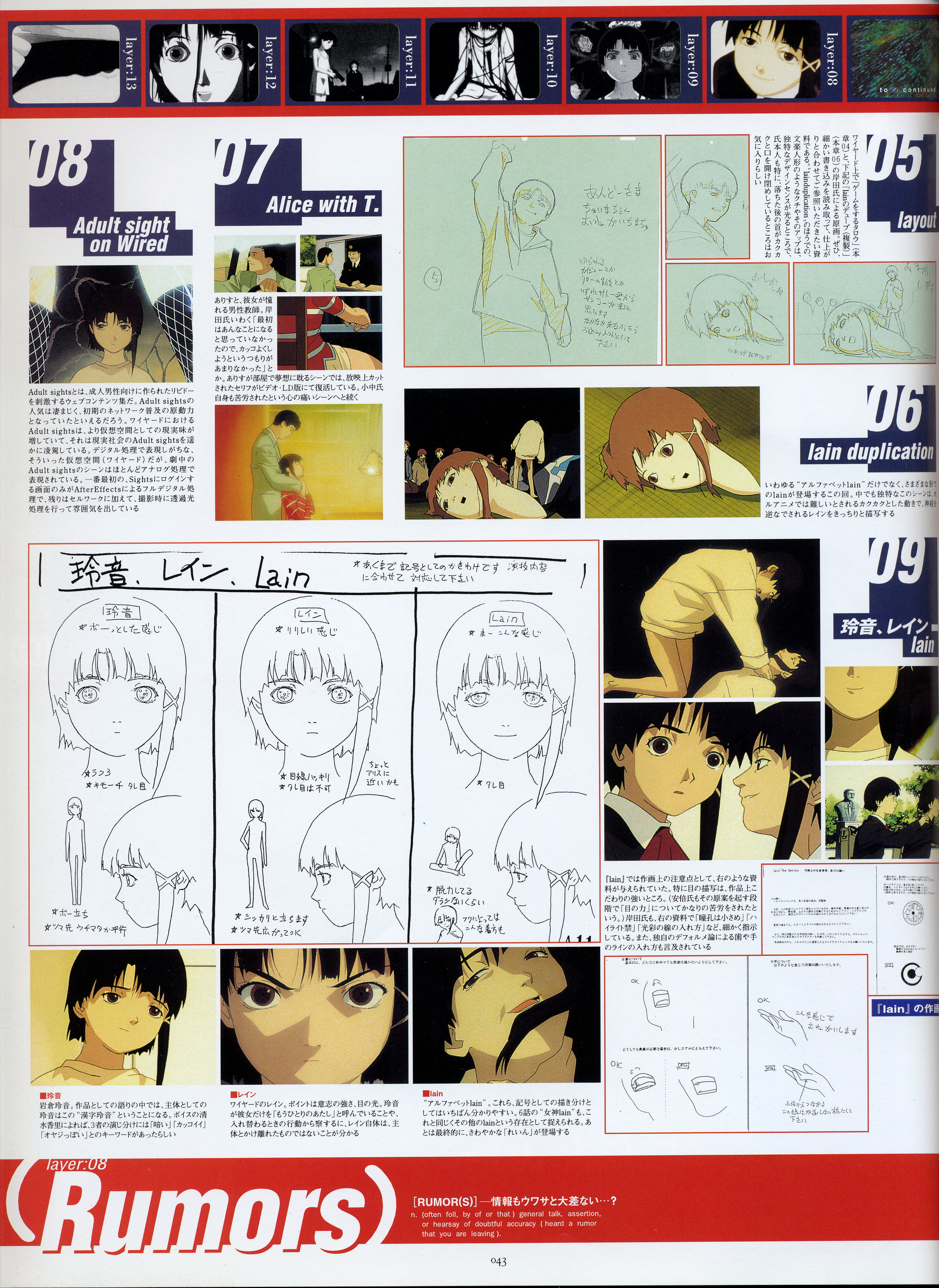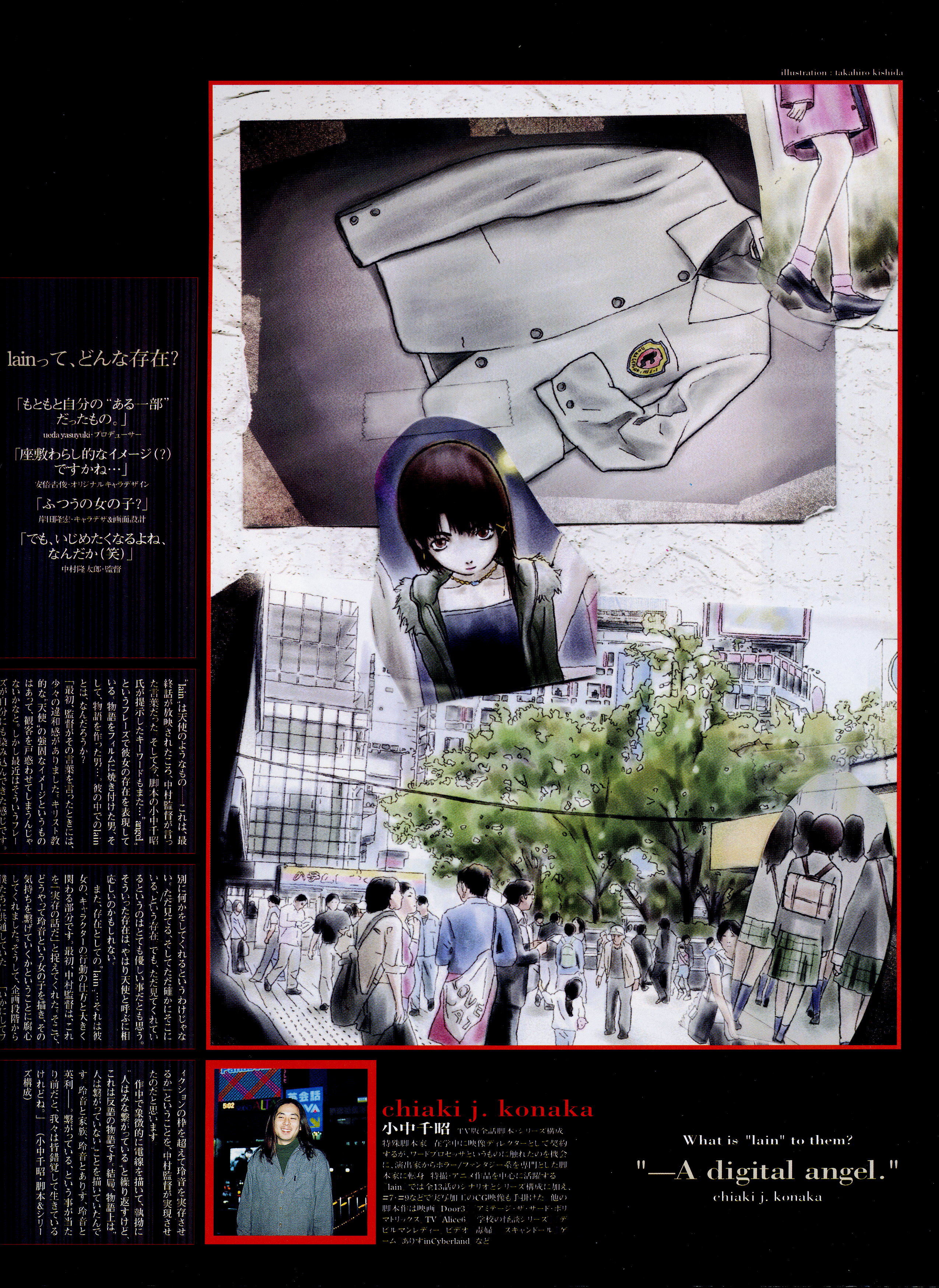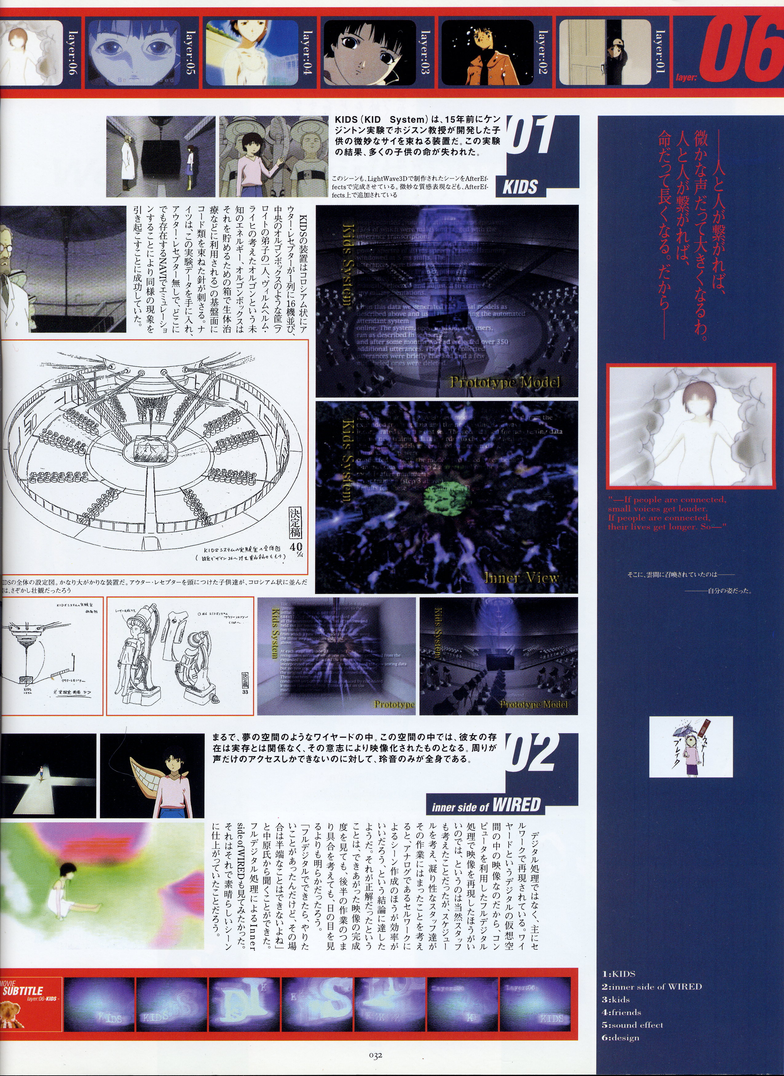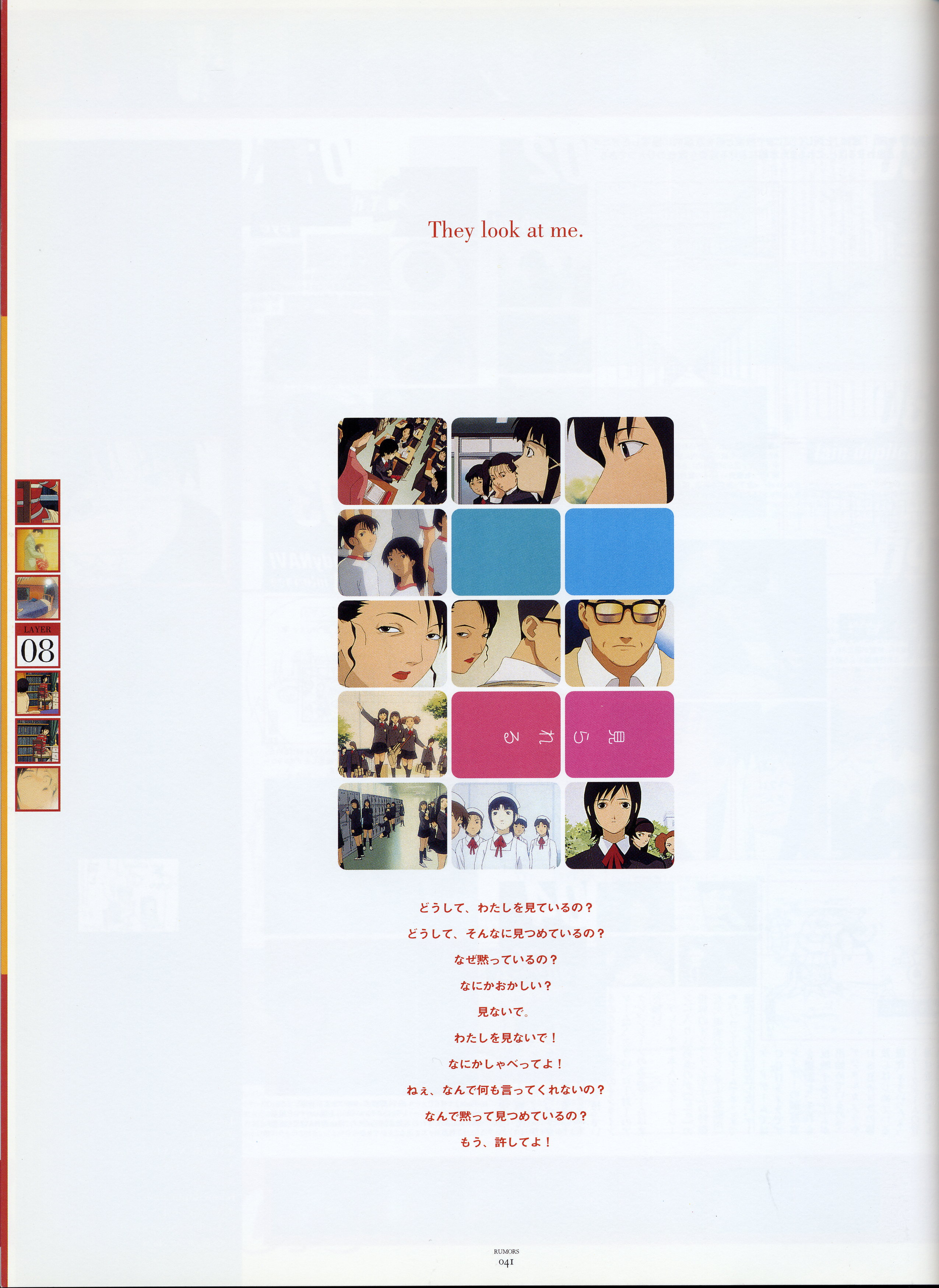: после выпуска артбука Lain Illustrations (переиздание omnipresence in Wired) самым редким для поклонников стало издание Visual Experiments Lain, которое до сих пор отсутствовало даже в электронном виде в сети. Ко мне в руки чудом попал этот замечательный артбук (хвала японским букинистам на eBay =)) и я не преминул возможностью оставить его в истории. Книга содержит уйму текста на японском (к своему горю, я ничего не понимаю из того, что там написано), кучу карандашных набросков, зарисовок, и прочего дополнительного арта, использовавшегося как рабочий материал при создании сериала. Здесь выложен абсолютно полный скан артбука в 300 dpi, сканировал сам, единственный минус - артбук больше стандартных A4, поэтому края не влезли.