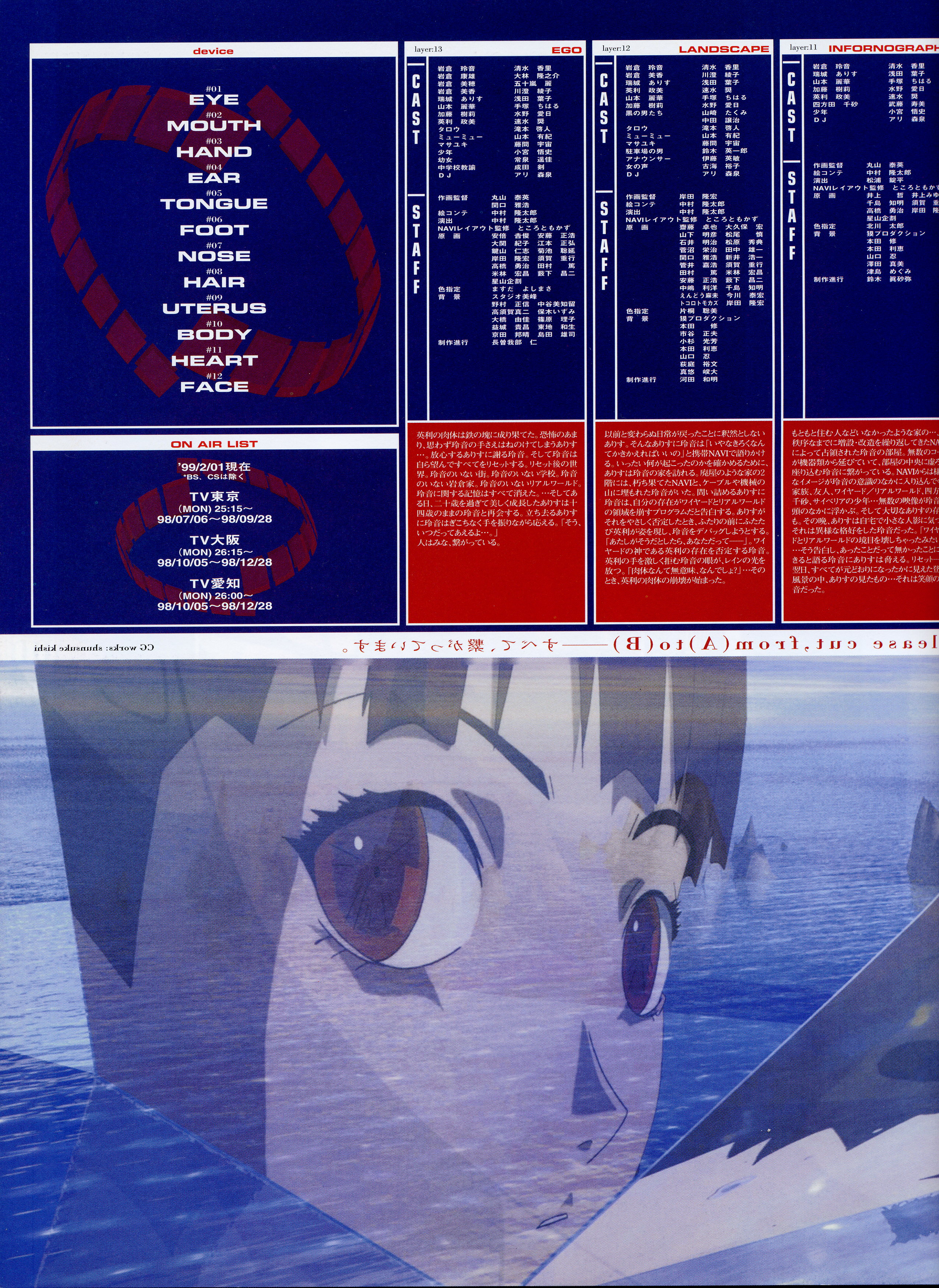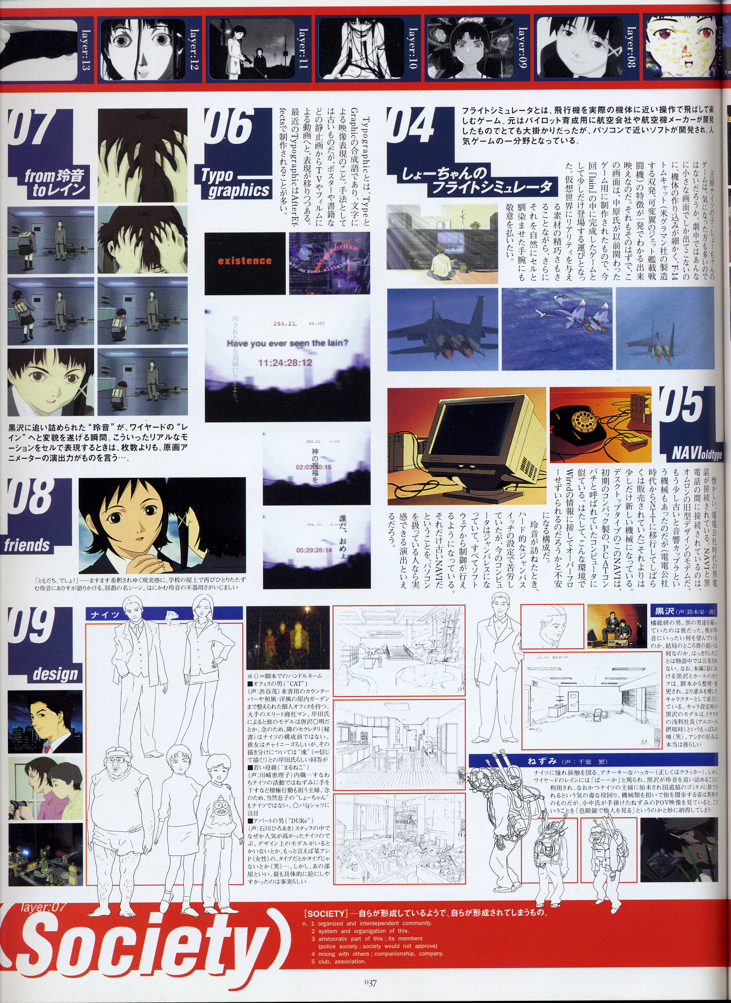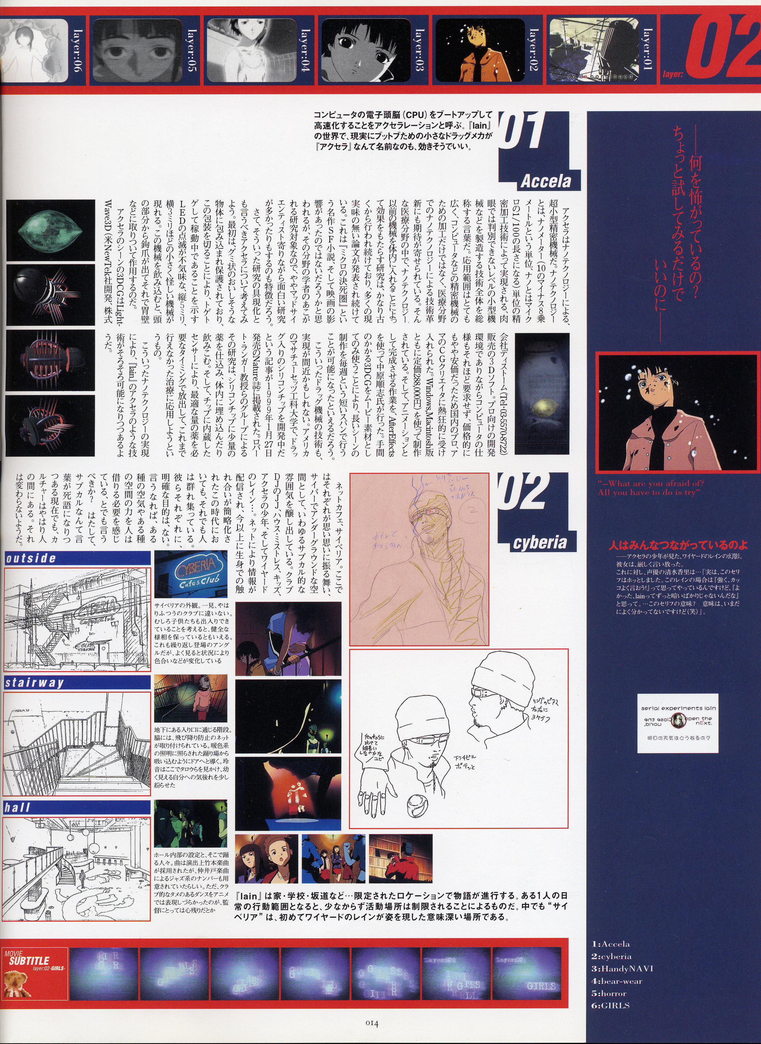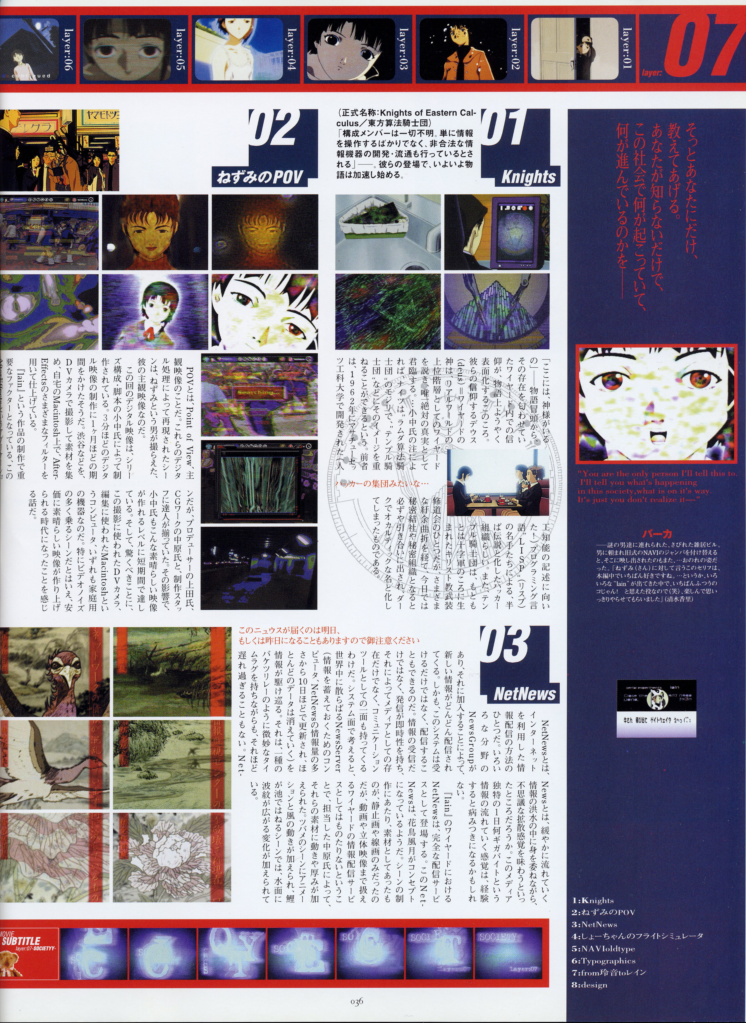 : после выпуска артбука Lain Illustrations (переиздание omnipresence in Wired) самым редким для поклонников стало издание Visual Experiments Lain, которое до сих пор отсутствовало даже в электронном виде в сети. Ко мне в руки чудом попал этот замечательный артбук (хвала японским букинистам на eBay =)) и я не преминул возможностью оставить его в истории. Книга содержит уйму текста на японском (к своему горю, я ничего не понимаю из того, что там написано), кучу карандашных набросков, зарисовок, и прочего дополнительного арта, использовавшегося как рабочий материал при создании сериала. Здесь выложен абсолютно полный скан артбука в 300 dpi, сканировал сам, единственный минус - артбук больше стандартных A4, поэтому края не влезли.