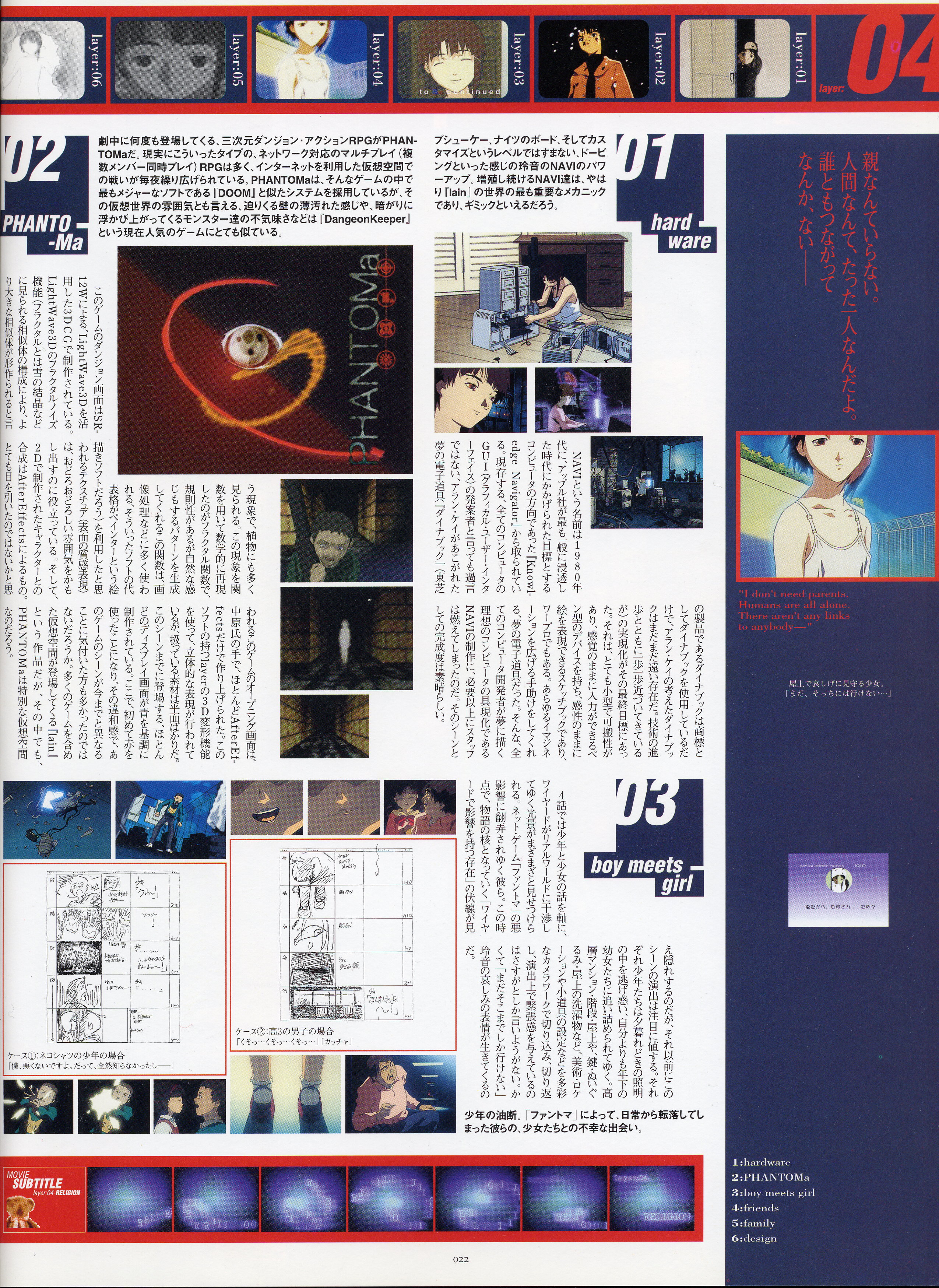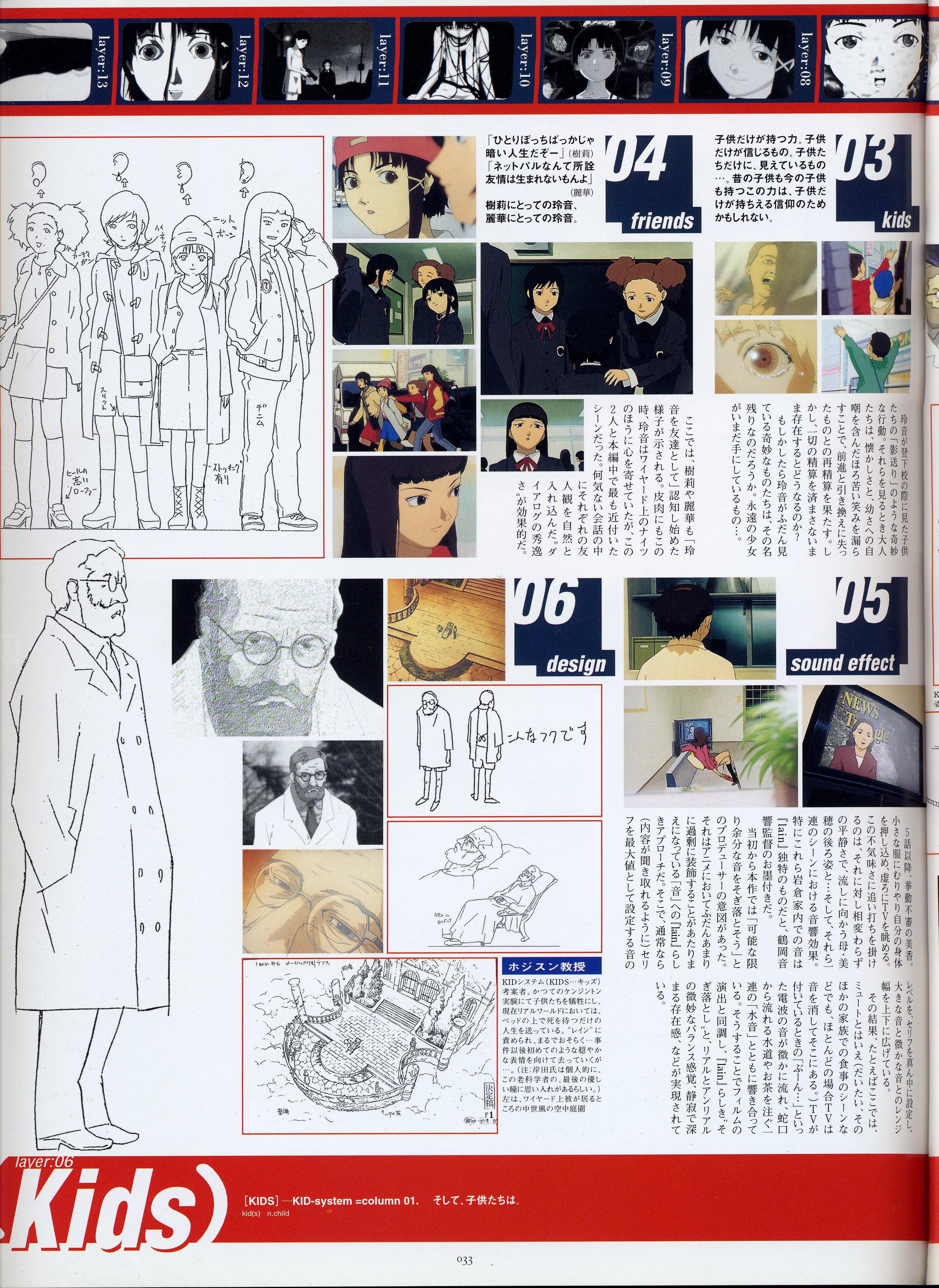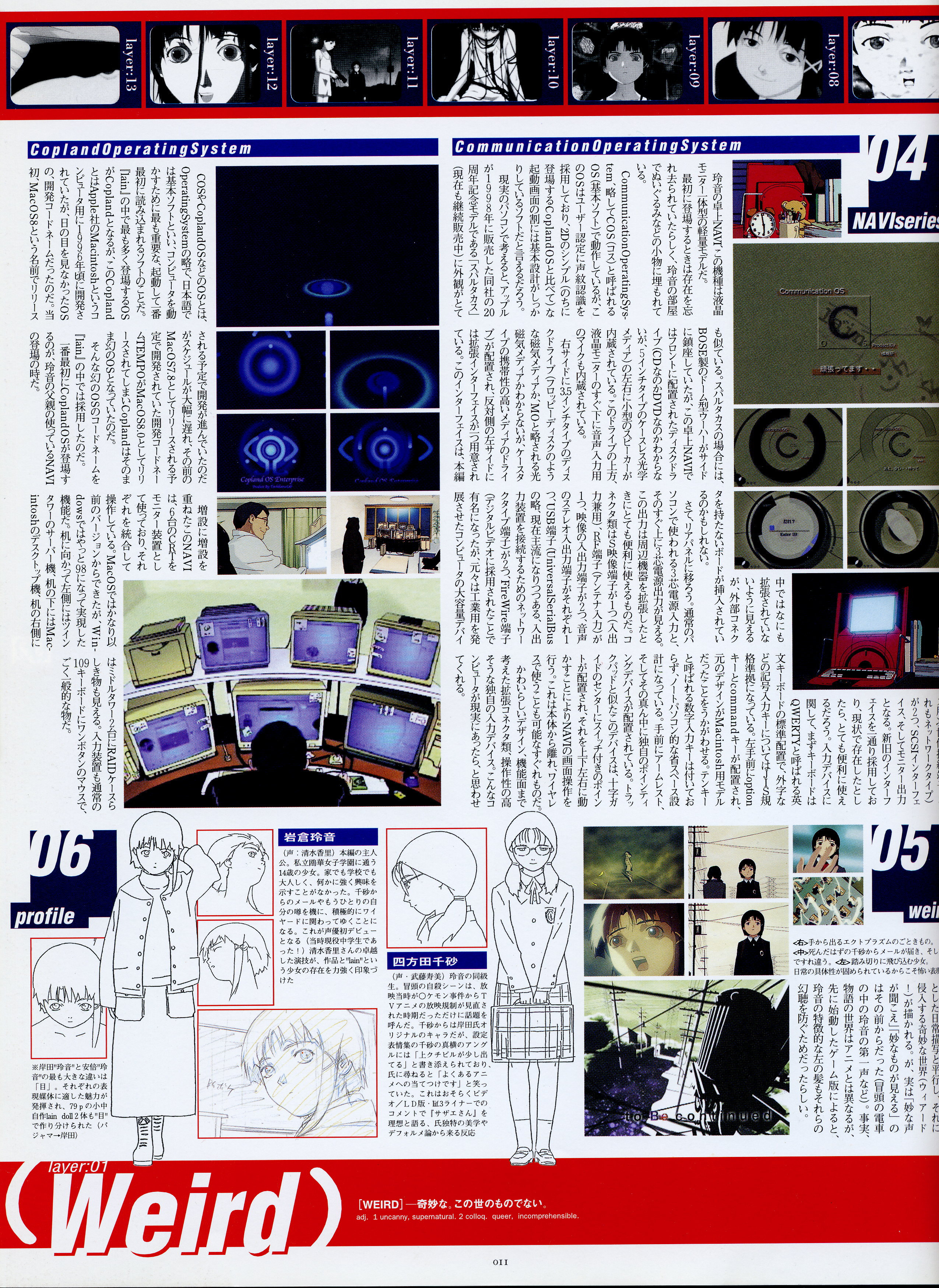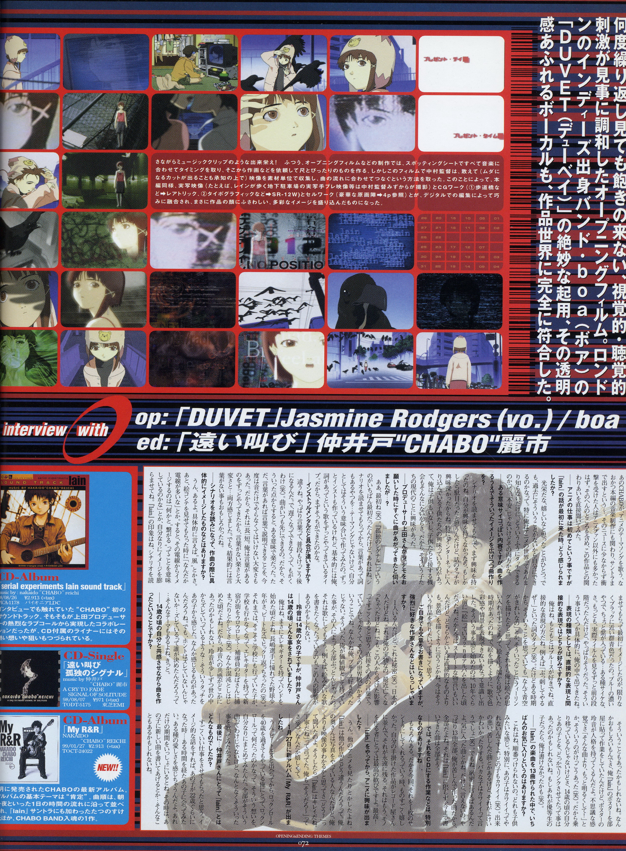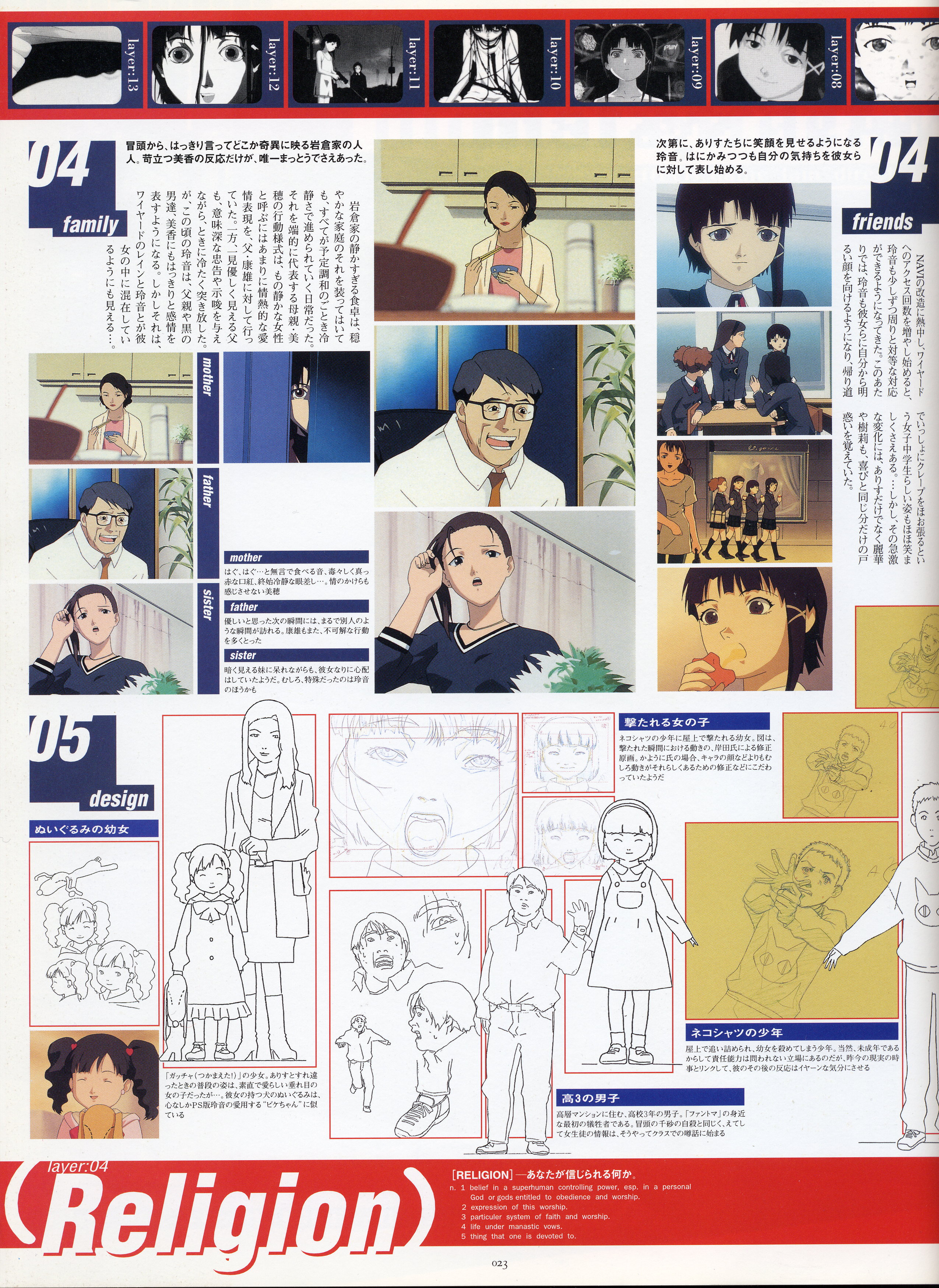 : после выпуска артбука Lain Illustrations (переиздание omnipresence in Wired) самым редким для поклонников стало издание Visual Experiments Lain, которое до сих пор отсутствовало даже в электронном виде в сети. Ко мне в руки чудом попал этот замечательный артбук (хвала японским букинистам на eBay =)) и я не преминул возможностью оставить его в истории. Книга содержит уйму текста на японском (к своему горю, я ничего не понимаю из того, что там написано), кучу карандашных набросков, зарисовок, и прочего дополнительного арта, использовавшегося как рабочий материал при создании сериала. Здесь выложен абсолютно полный скан артбука в 300 dpi, сканировал сам, единственный минус - артбук больше стандартных A4, поэтому края не влезли.
