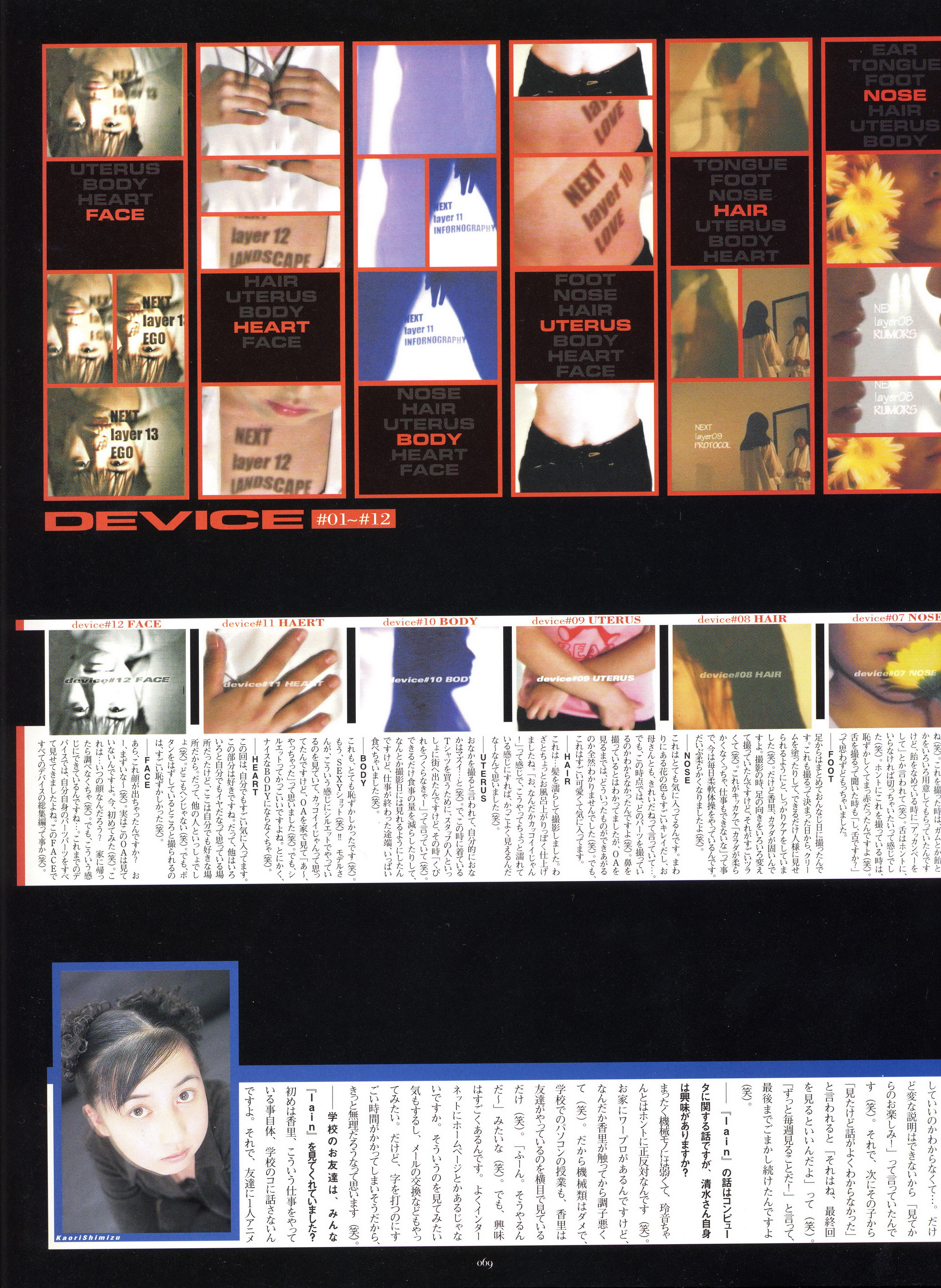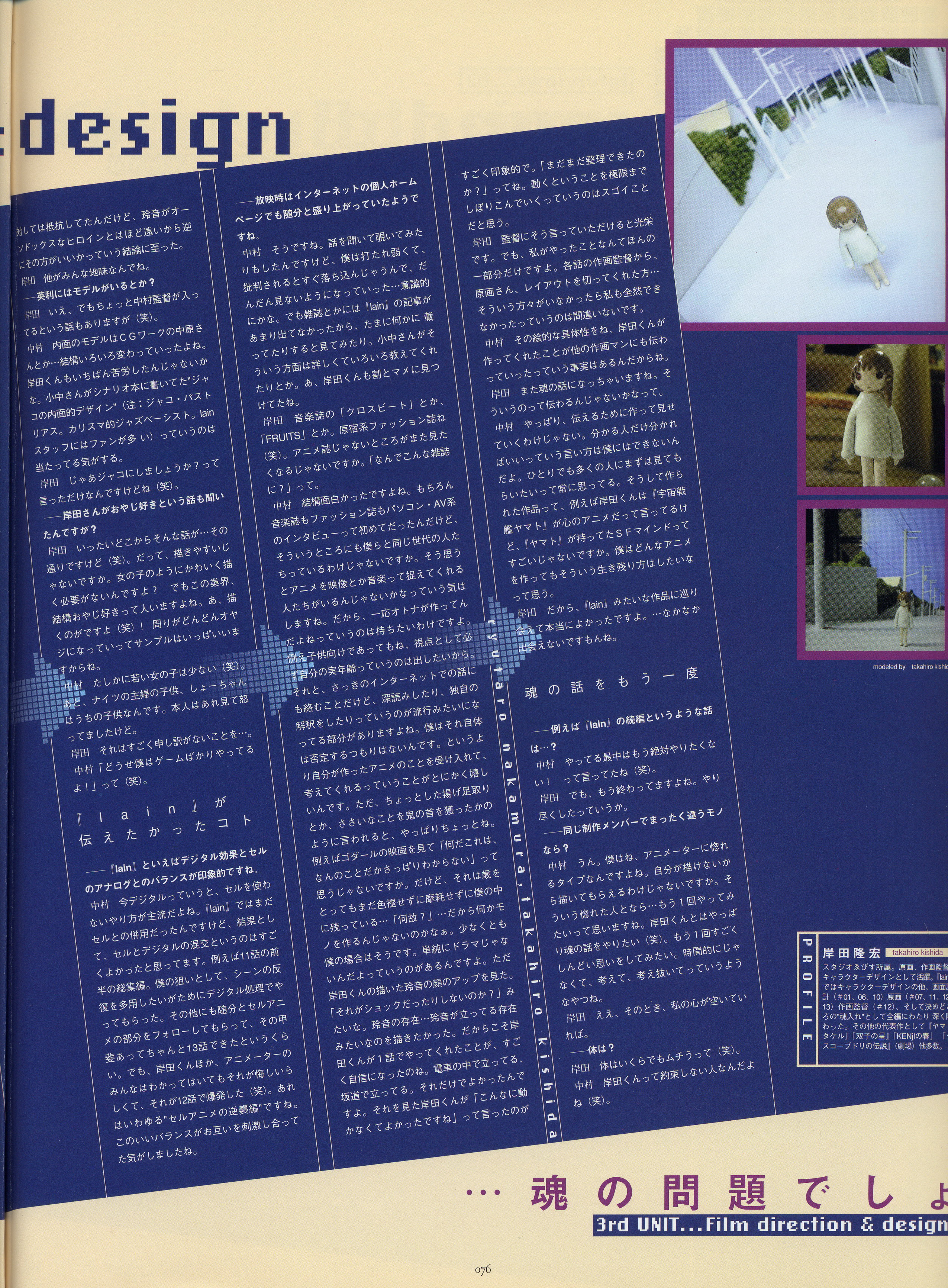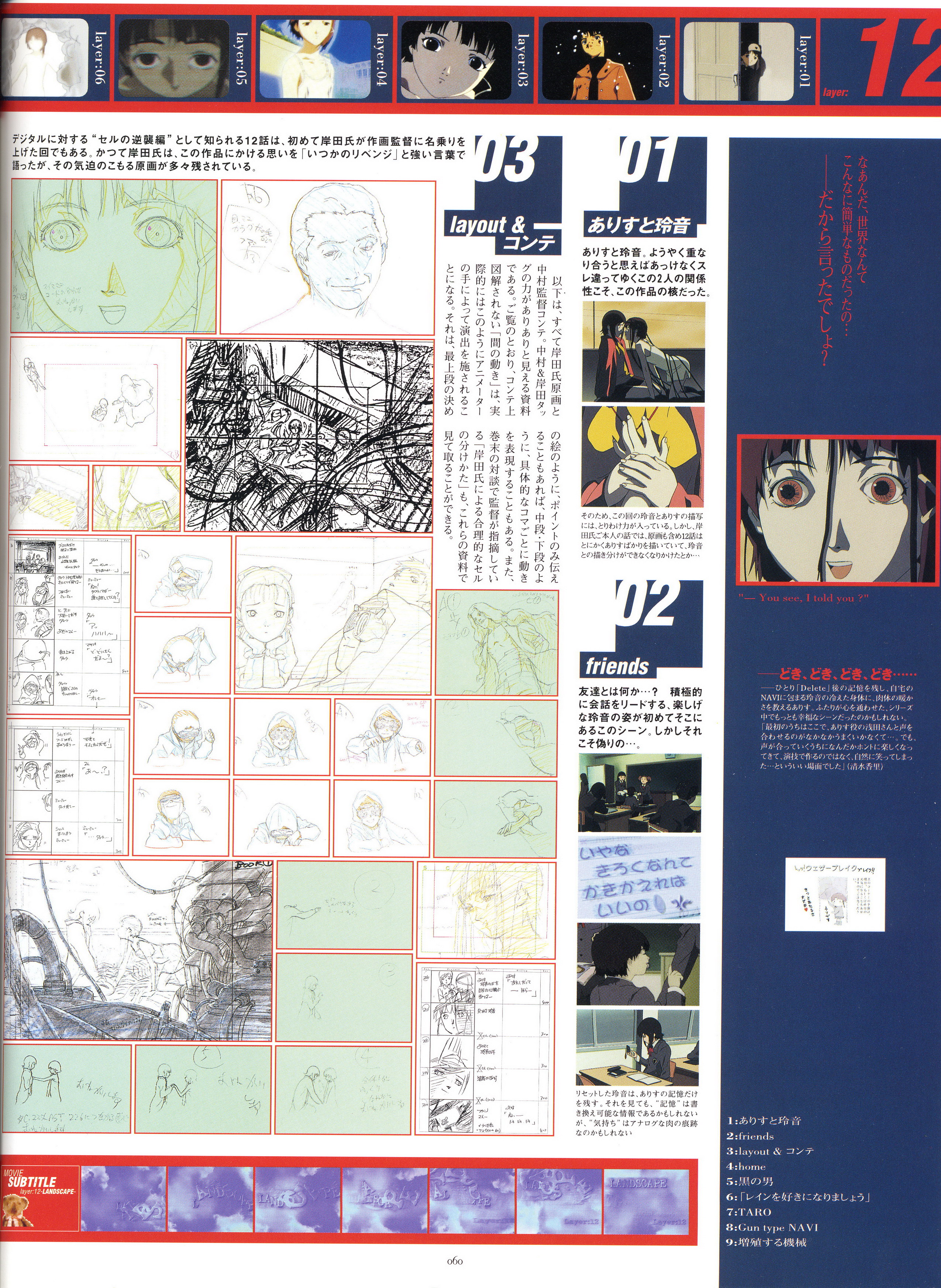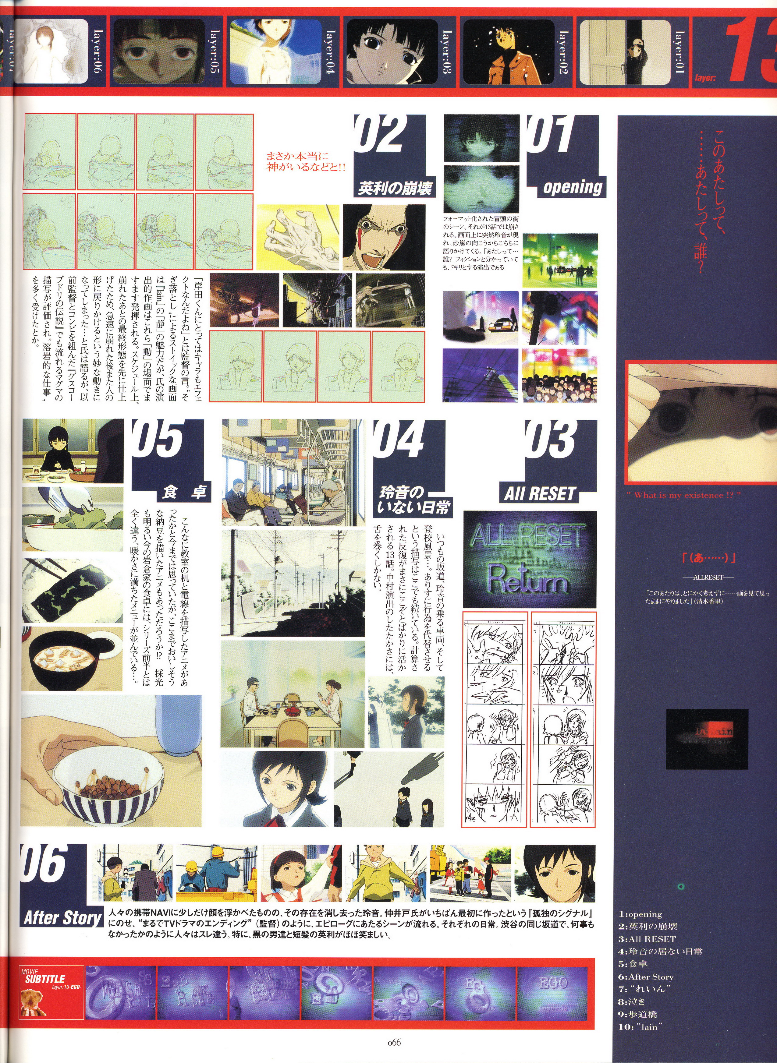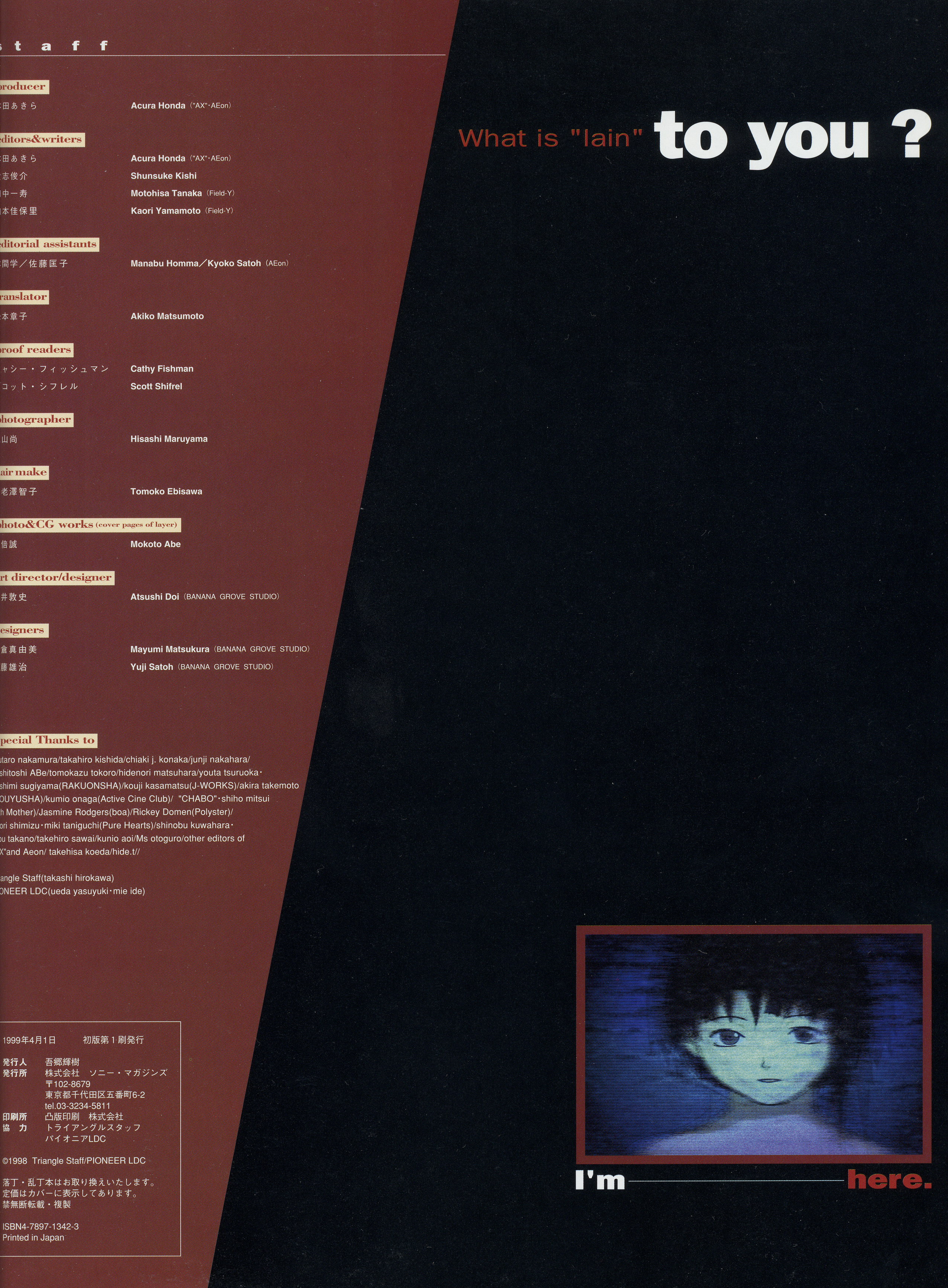 : после выпуска артбука Lain Illustrations (переиздание omnipresence in Wired) самым редким для поклонников стало издание Visual Experiments Lain, которое до сих пор отсутствовало даже в электронном виде в сети. Ко мне в руки чудом попал этот замечательный артбук (хвала японским букинистам на eBay =)) и я не преминул возможностью оставить его в истории. Книга содержит уйму текста на японском (к своему горю, я ничего не понимаю из того, что там написано), кучу карандашных набросков, зарисовок, и прочего дополнительного арта, использовавшегося как рабочий материал при создании сериала. Здесь выложен абсолютно полный скан артбука в 300 dpi, сканировал сам, единственный минус - артбук больше стандартных A4, поэтому края не влезли.